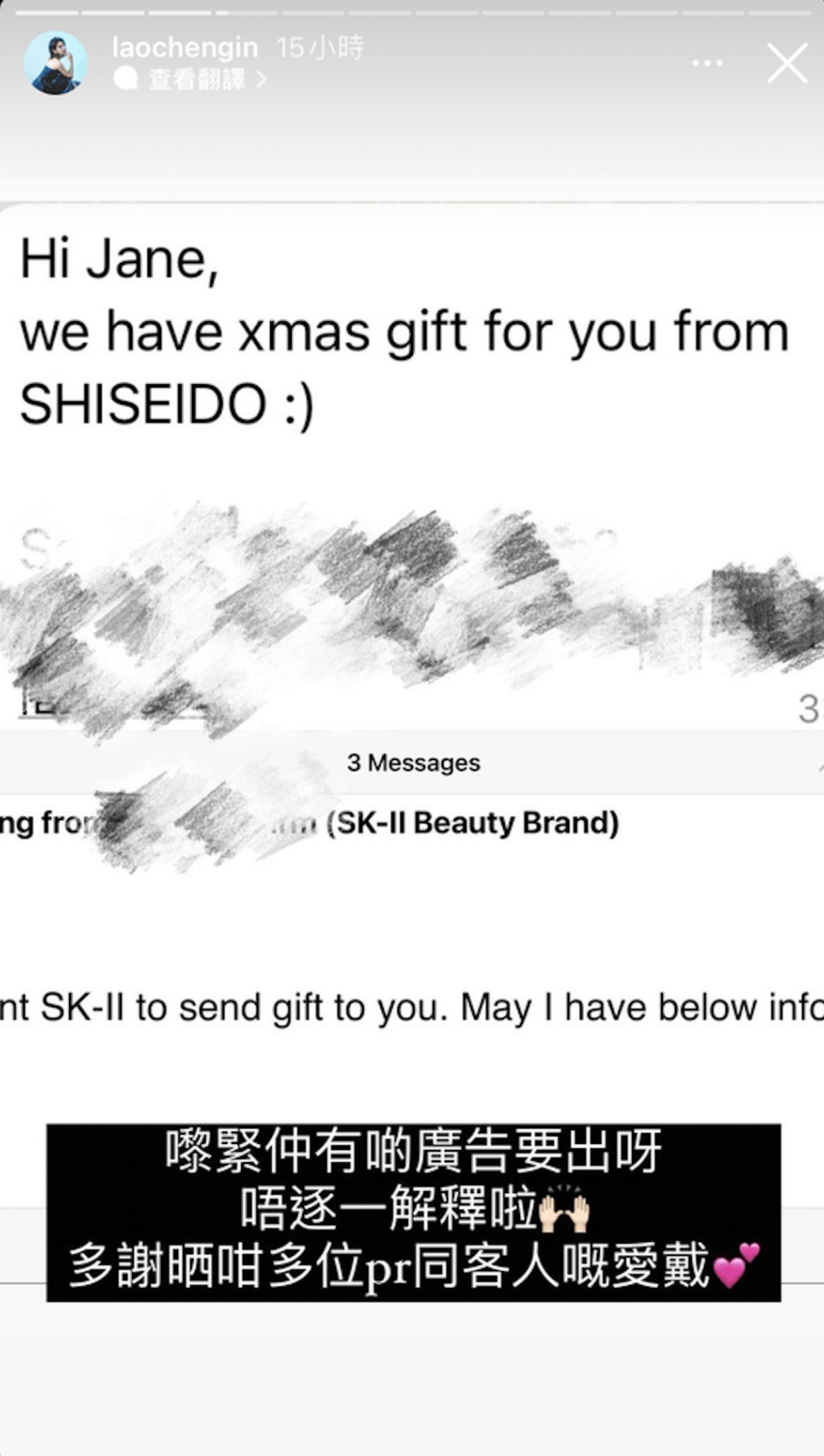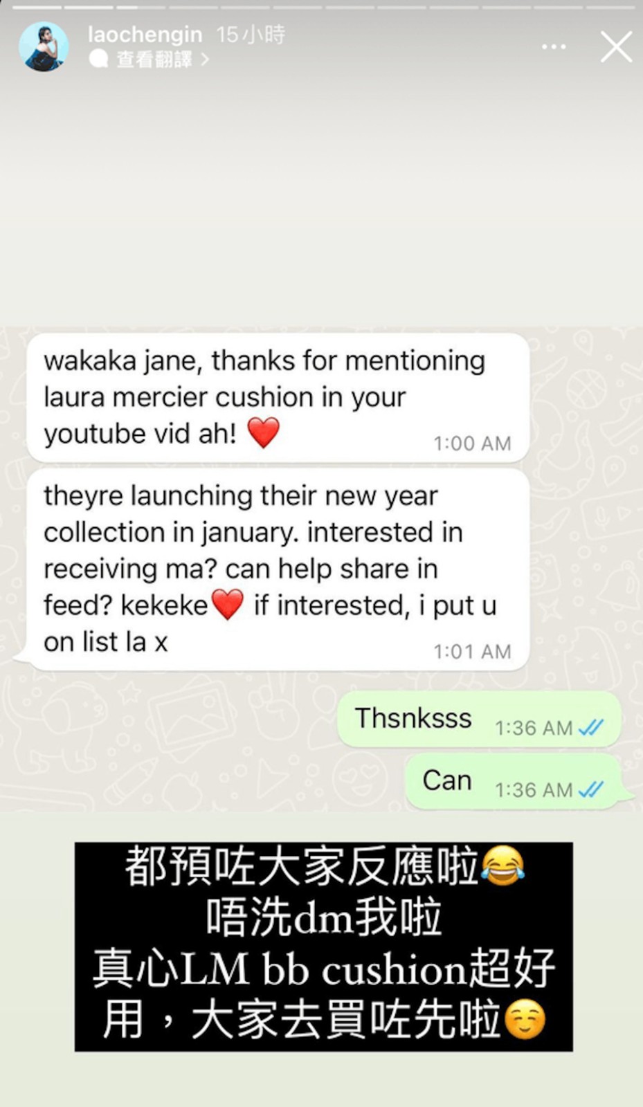 為證清白,阿晶亦貼出多張與公關的對話證明是對方主動邀請出Post和寄送產品(圖:Instagram @laochengi)