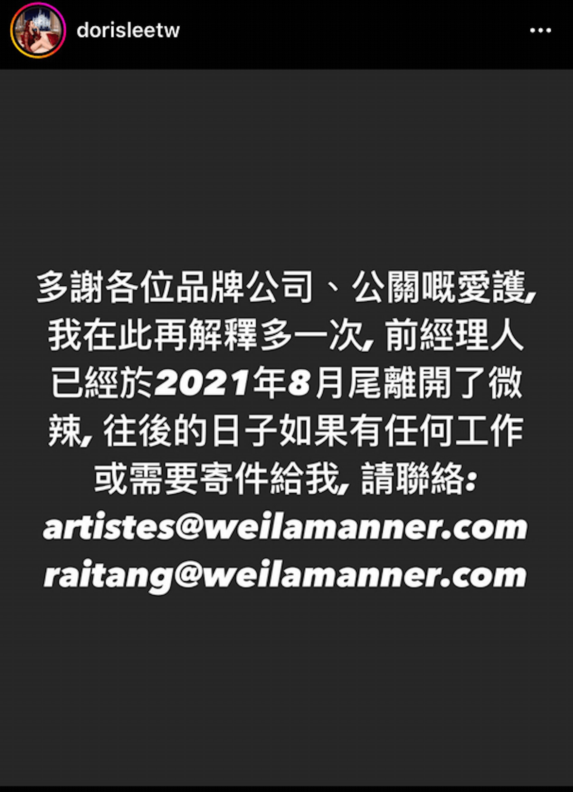 繼阿晶於21年離開微辣,Doris在22年1月就出Post呼籲品牌寄公關品不要寄錯地址(圖:Instagram @dorisleetw)