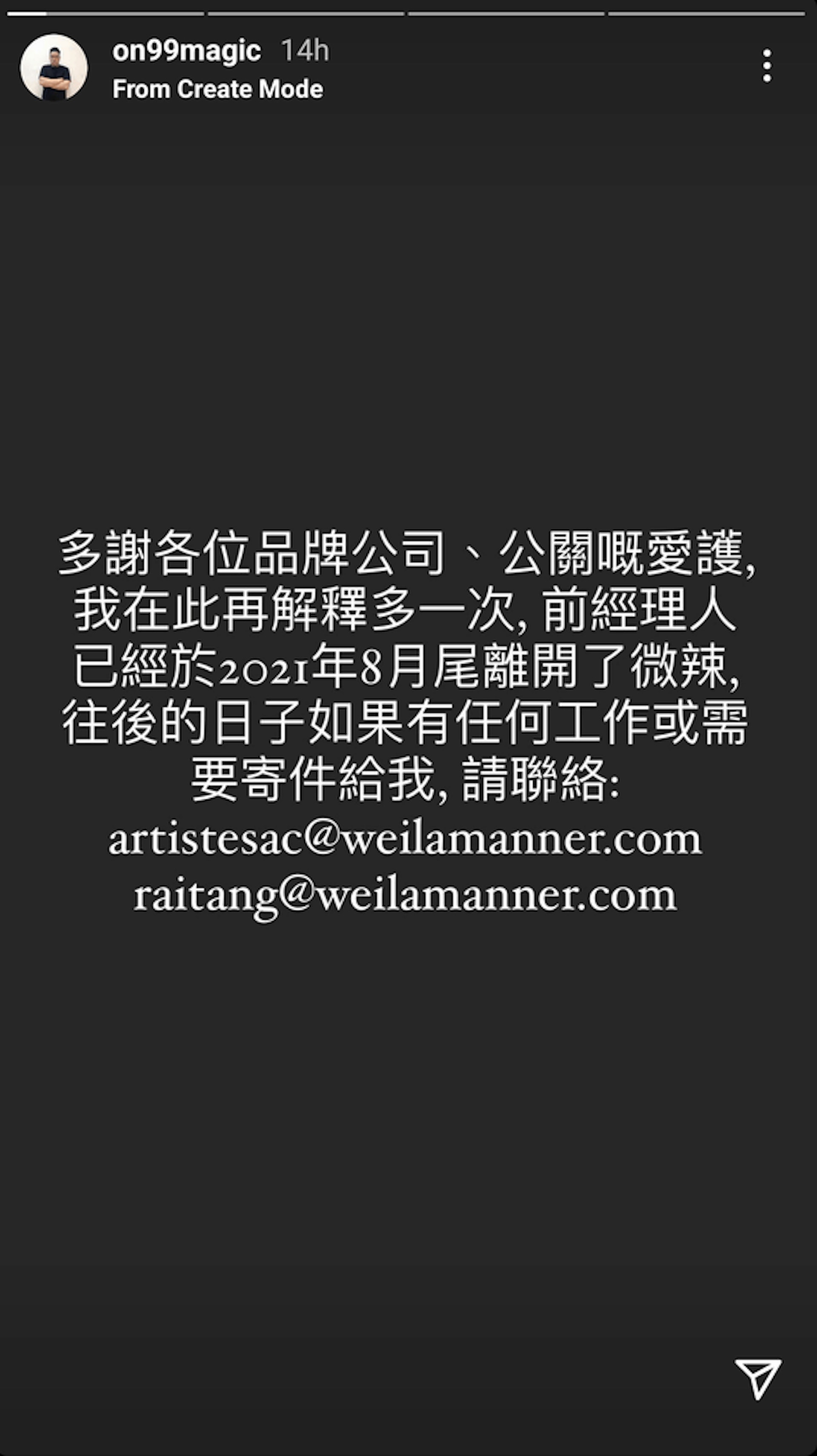 阿晶於21年離開微辣,Doris在22年1月就出Post呼籲品牌寄公關品不要寄錯地址,帖文寫道「前經理人已經於2021年8月尾離開了微辣,往後的日子如果有任何工作或需要寄件給我,請聯絡……」隨即寫下兩個微辣的電郵地址,而其他微辣成員都有轉載帖文,當中甚至包括阿晶舊愛加蔥。