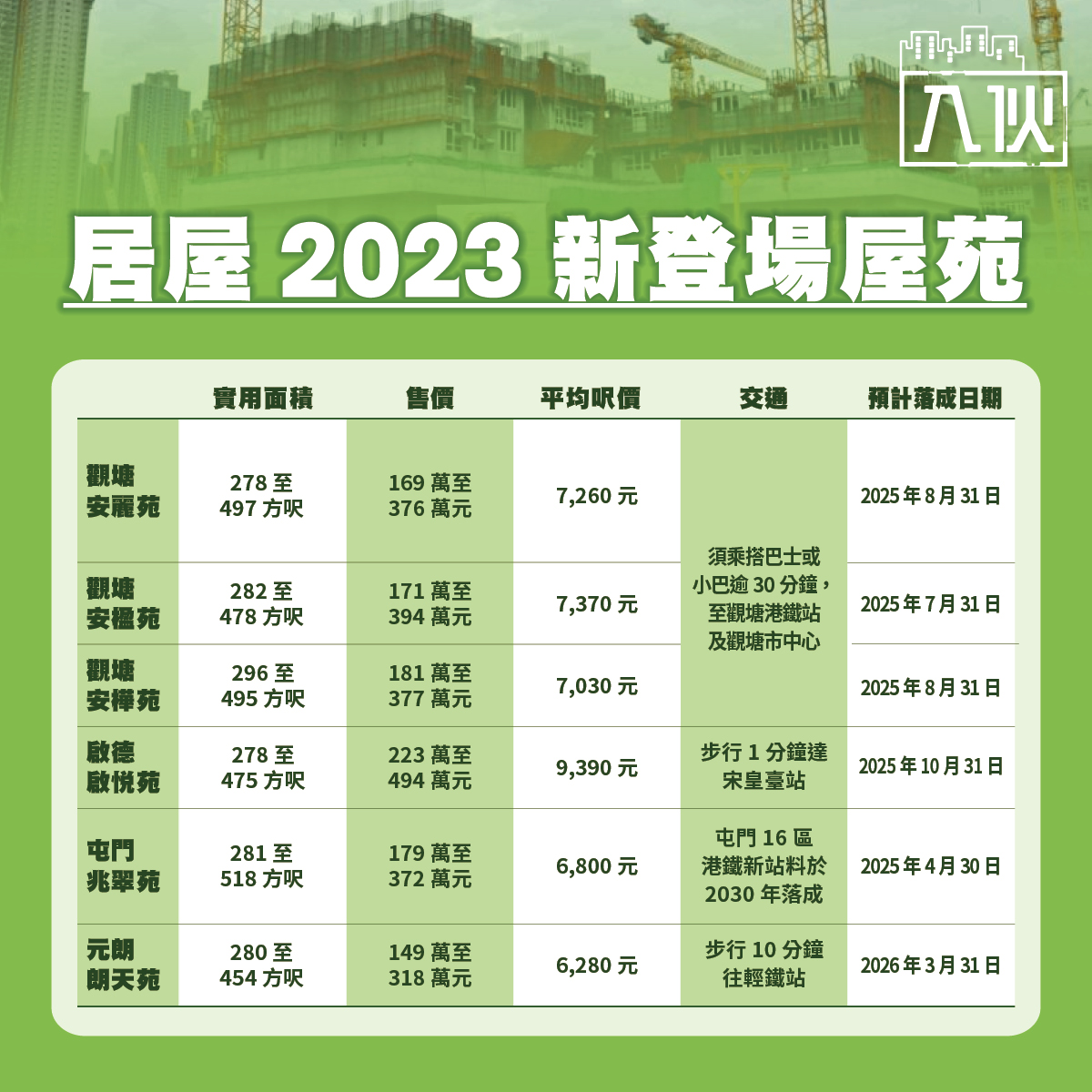 「居屋2023」合共推出六個新屋苑,包括觀塘安達臣道的安楹苑、安麗苑、安樺苑、啟德啟悅苑、元朗朗天苑及屯門兆翠苑,均以市價六二折發售,售價介乎169萬至494萬元。戶型方面,今年主打300多至400多方呎的一房單位,佔整體約一半。必須留意的是,居屋2023將在今個月底開始接受報名,可於網上申請或親身到房委會辦事處遞表,詳情如下: