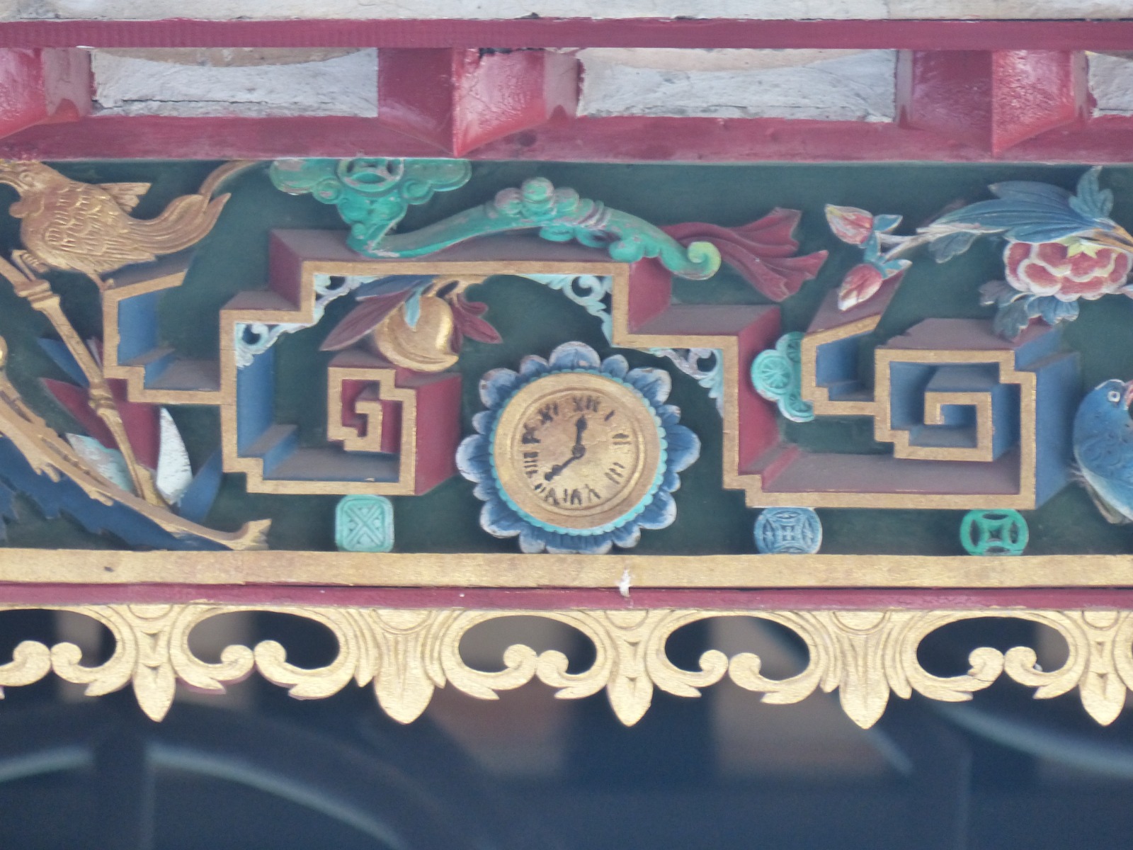 書中有趣之處甚多,其中一個令人意想不到的是,原來西方的鐘曾經寓意長壽。在華人社會裡,以時鐘作禮一向被視為忌諱,何解在中式建築上卻出現鐘的圖樣呢?鐘最早於明朝傳入中國,只有貴族才有機會一睹其貌。當時的鐘製作精美,無需能源便可不斷運行,鐘此事物因而漸漸地有了「循環不斷、生生不息」的寓意。有一些鐘更會刻上魚紋圖案,取「魚」與「餘」之諧音,寓意「有餘」。如此,兩者結合則為「長壽有餘」的意思。今日,大家可在屏山坑頭村的民居、新田大夫第等地方,找到它們的蹤跡。