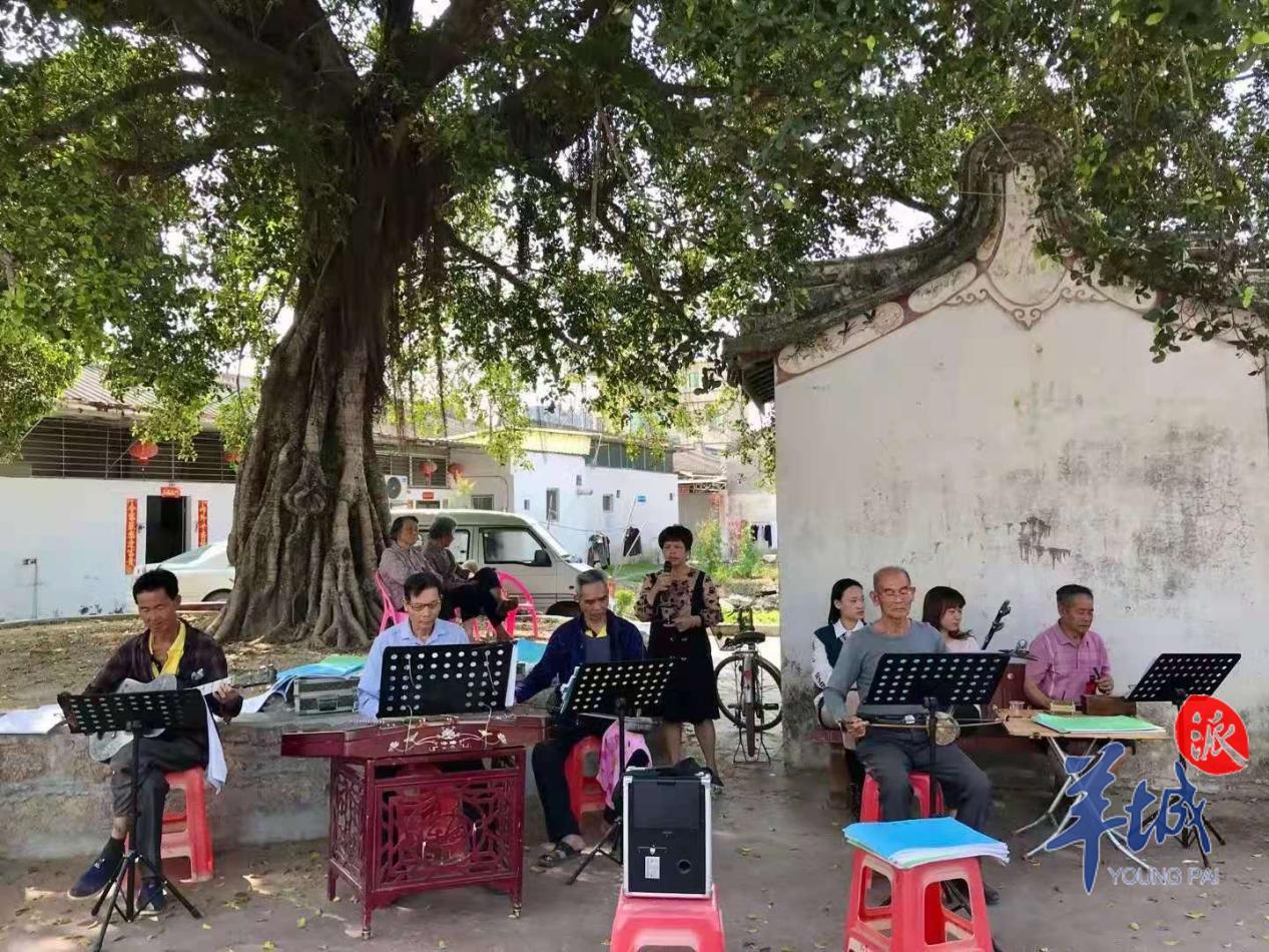 走進登塘鎮白水村中,不時可見三五村民呼朋引伴攜帶樂器一同前行,正是村民自發相約演奏傳統潮樂。村中大榕樹青翠如蓋,在榕樹下、鑊耳墻邊,悠揚的曲聲從二胡、古箏裡流淌出,飄上枝頭,繞在瓦上,悠然的古村圖景緩緩呈現出來。登塘鎮有許多自發成立的民間潮樂或潮曲團,他們或擊鑼鼓、或吹橫笛、或撥琵琶……不同的樂器配合,絲竹金石聲帶來的是土地的回憶和淡淡的鄉愁。