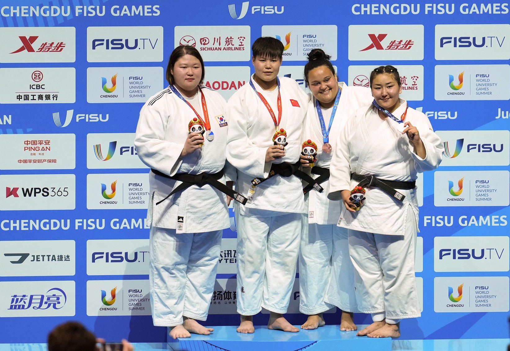 柔道項目+78公斤級比賽頒獎儀式,冠軍中國選手賈春迪(左二)、亞軍南韓選手樸新星(左一)、季軍巴西選手馬丁斯(右二)與蒙古選手達木巴達爾紮合影。