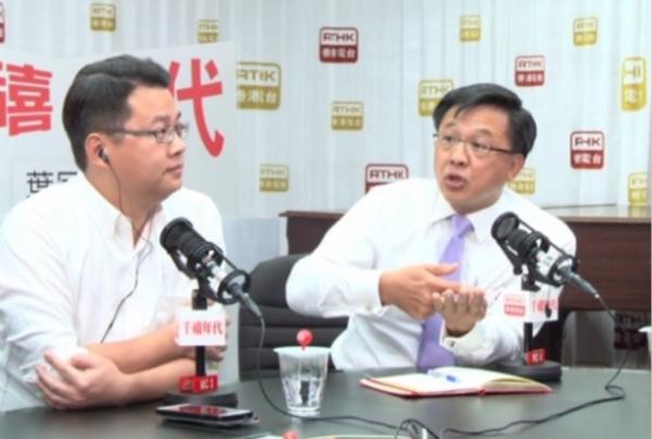 何君堯今早出席電台節目,籲朱凱迪就「官商鄉黑」提出證據。 港台截圖