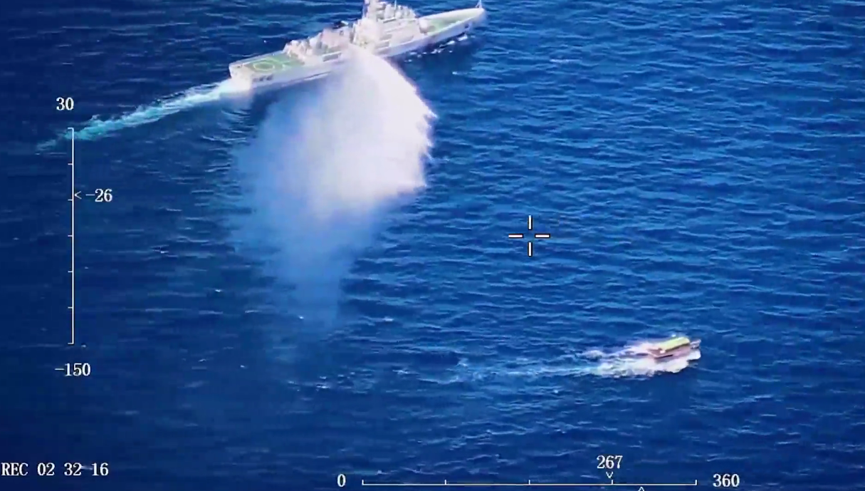 中國海警船進行警示性水炮噴射。