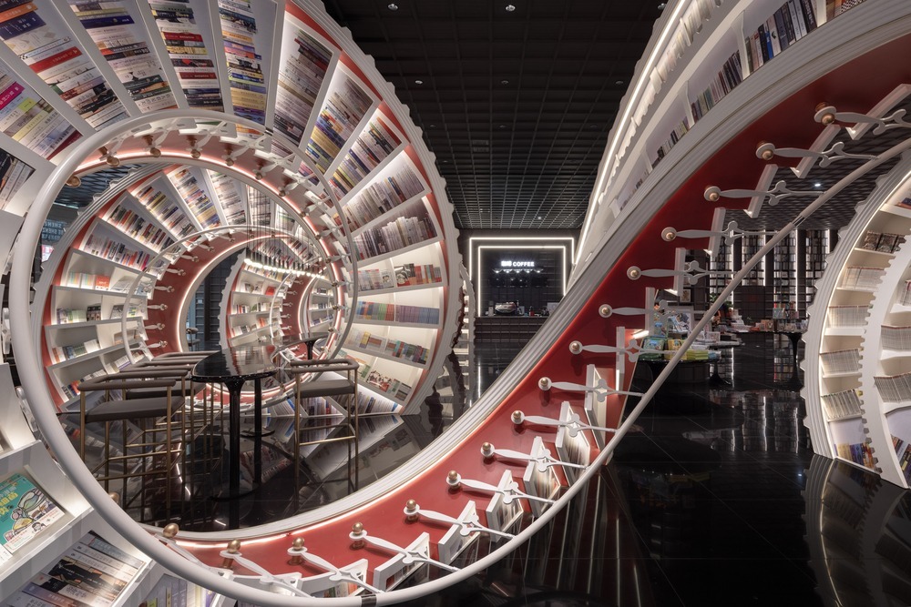 鍾書閣有「中國最美書店」之稱,一入門口已經能夠感受到她的不凡氣質。一排排紅色螺旋型設計的書架從大門口延伸至整座書店,通透的燈光貫通其中,氣勢不凡,是經典打卡位。旁邊還有一座座高至樓頂的書牆,頗具氣勢。