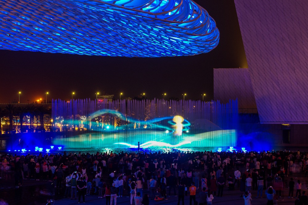 公園上還有一座濱海藝術中心,中心外有一座音樂噴泉,每晚都會上演音樂噴泉燈光秀及巨幕投影表演。熣燦的燈光配上柔揚的音樂,噴泉隨節奏起舞,將歡樂港灣的氣氛推向高峰。每晚七時開秀,是必到的打卡點。