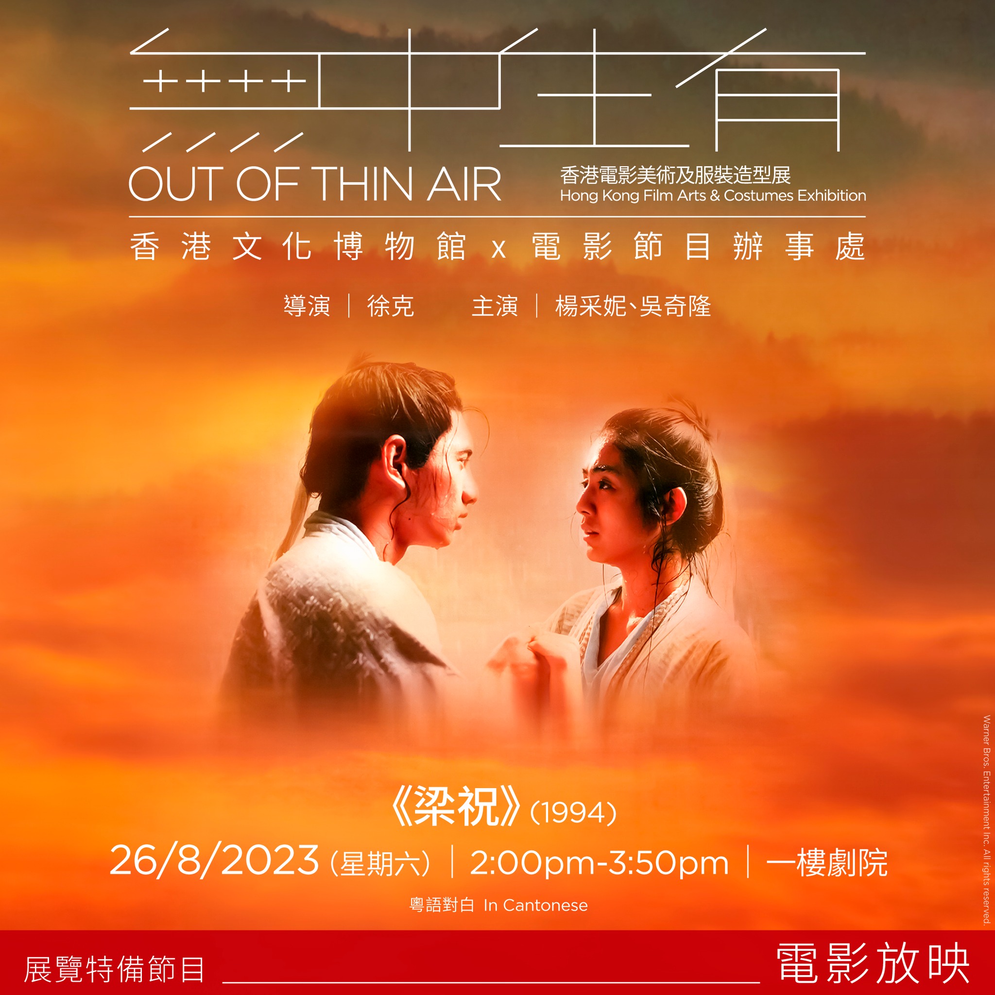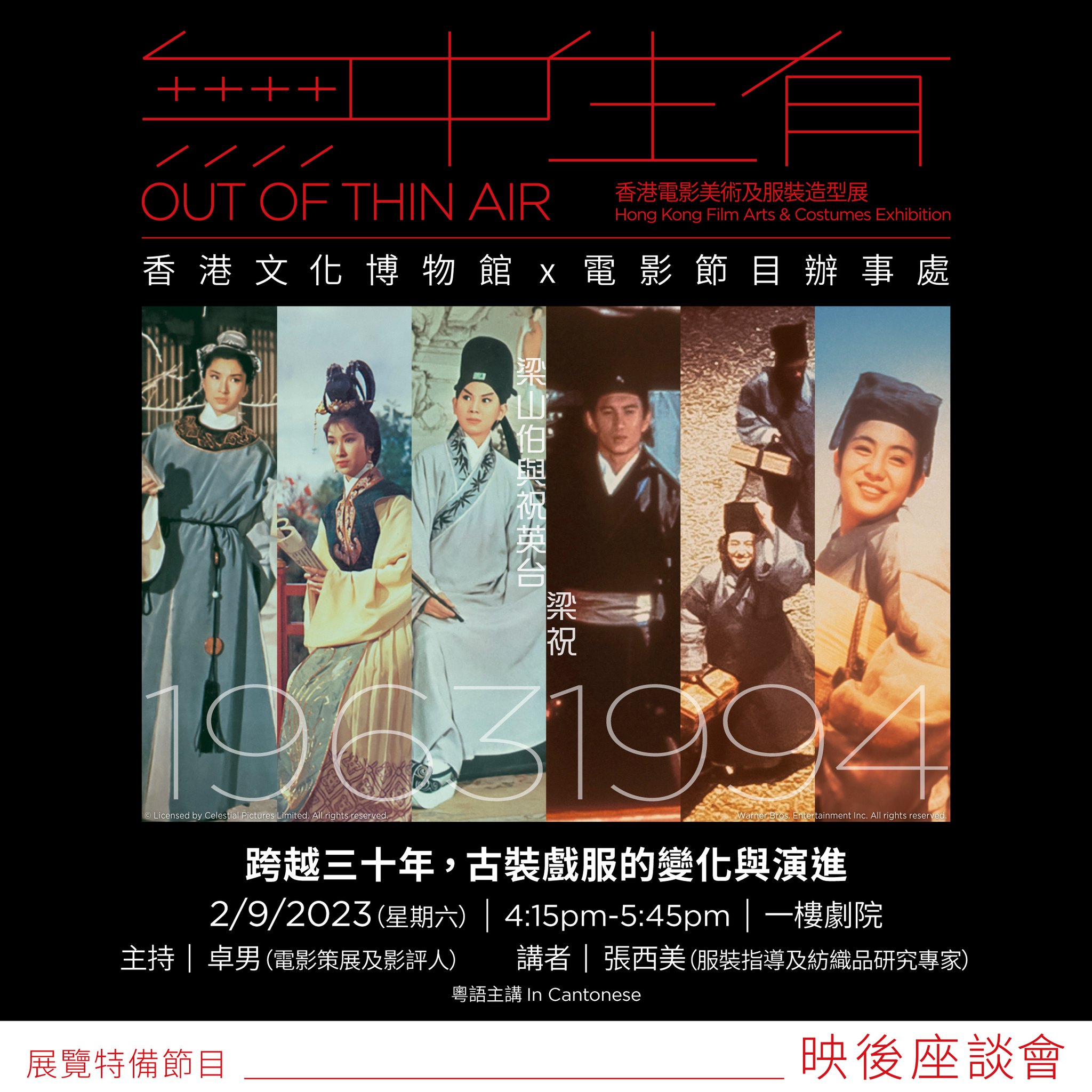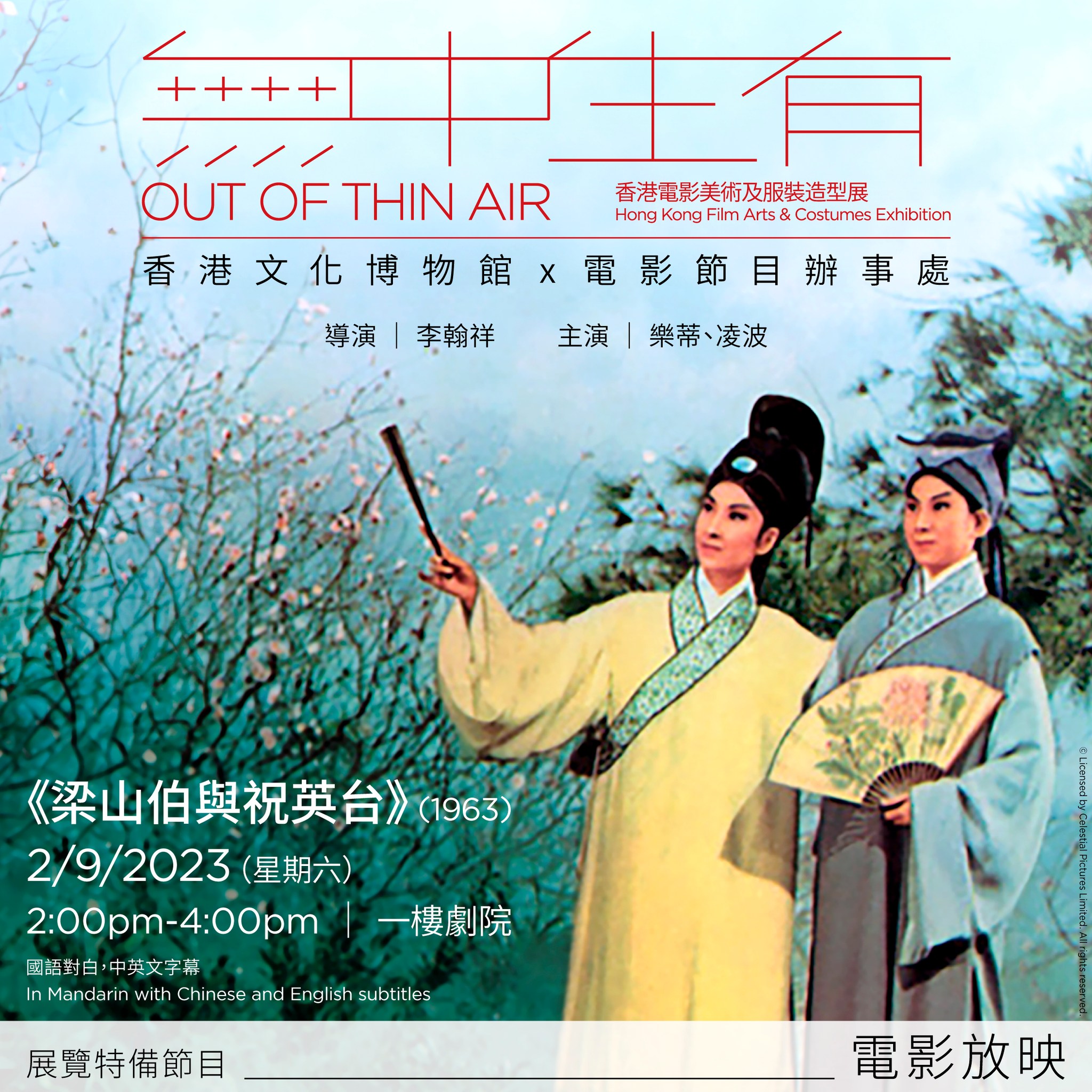 為配合「無中生有—香港電影美術及服裝造型展」,香港文化博物館將舉辦兩齣電影放映及「跨越三十年,古裝戲服的變化與演進」映後談,由講者分析兩代「梁祝」如何巧妙運用紡織材料、色彩搭配及剪裁技藝去呈現中國古代服飾的演變。所有特別活動均免費參與,先到先得。