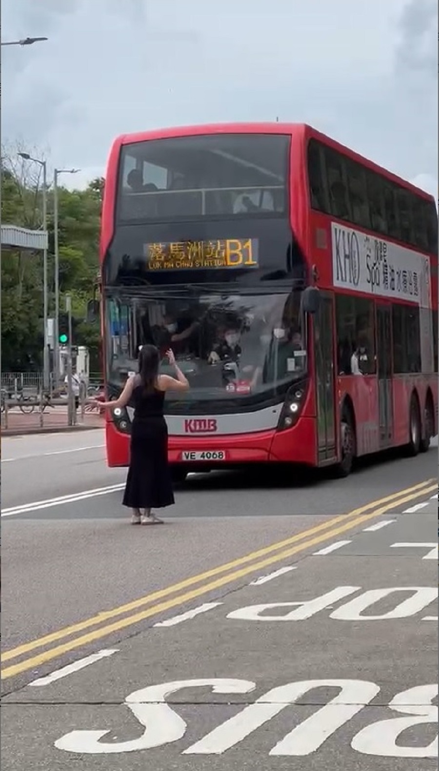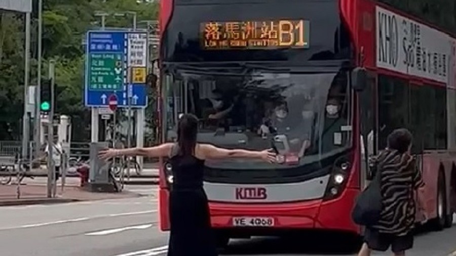 【橙訊】隨着內地與香港恢復全面通關,大批港人每逢周末北上食喝玩樂,各大關口及前往管制站的巴士路線均擠滿前往深圳的旅客。網上近日流傳一段短片,只見一名女子站在落馬洲(新田)公共運輸交匯處對開行車路,疑不滿一輛前往落馬洲的B1巴士路線客滿「飛站」,於是化身「攔路虎」不准巴士離開。