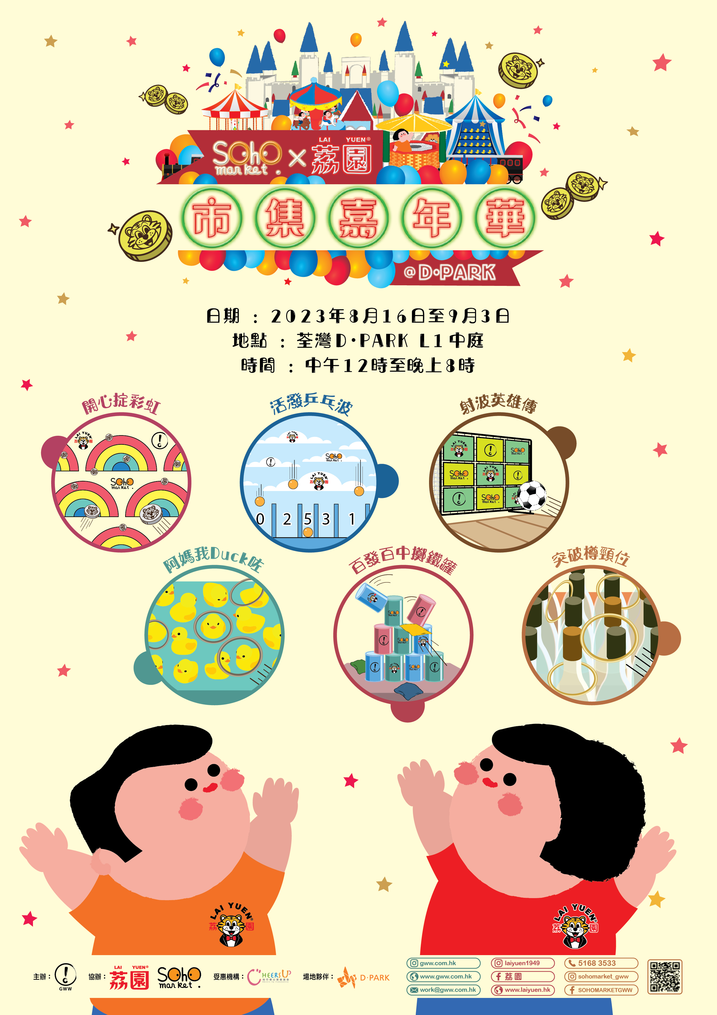 SOHO MARKET x 荔園市集嘉年華2023重點推介的節目,是於活動期間舉辦的荔園經典有獎攤位遊戲,包括開心掟彩虹、活潑乒乓波、射波英雄傳、阿媽我Duck咗、百發百中擲鐵罐以及突破樽頸位等,屆時亦準備了逾10,000份限量獎品送贈給大家,將「簡單的快樂」傳遞開去。