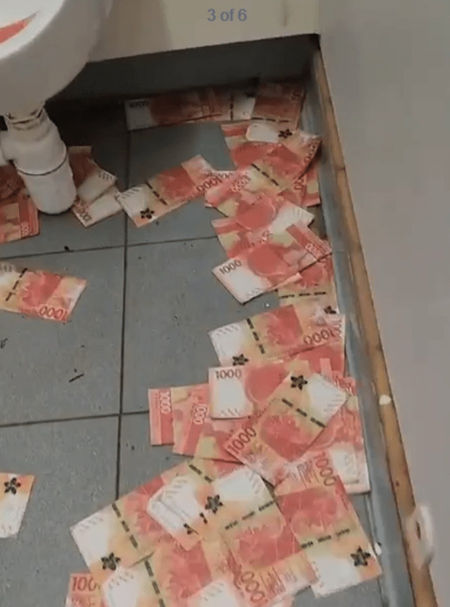 在大圍村公廁內,竟然滿地都是1000元「金牛」鈔票,數之不盡。
