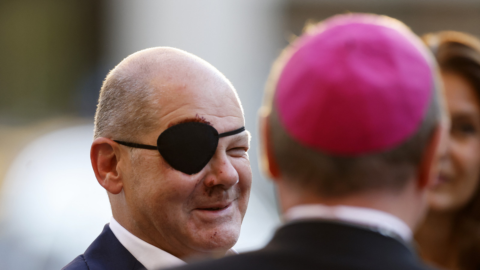 朔爾茨周一出席柏林天主教會活動時仍戴着眼罩。