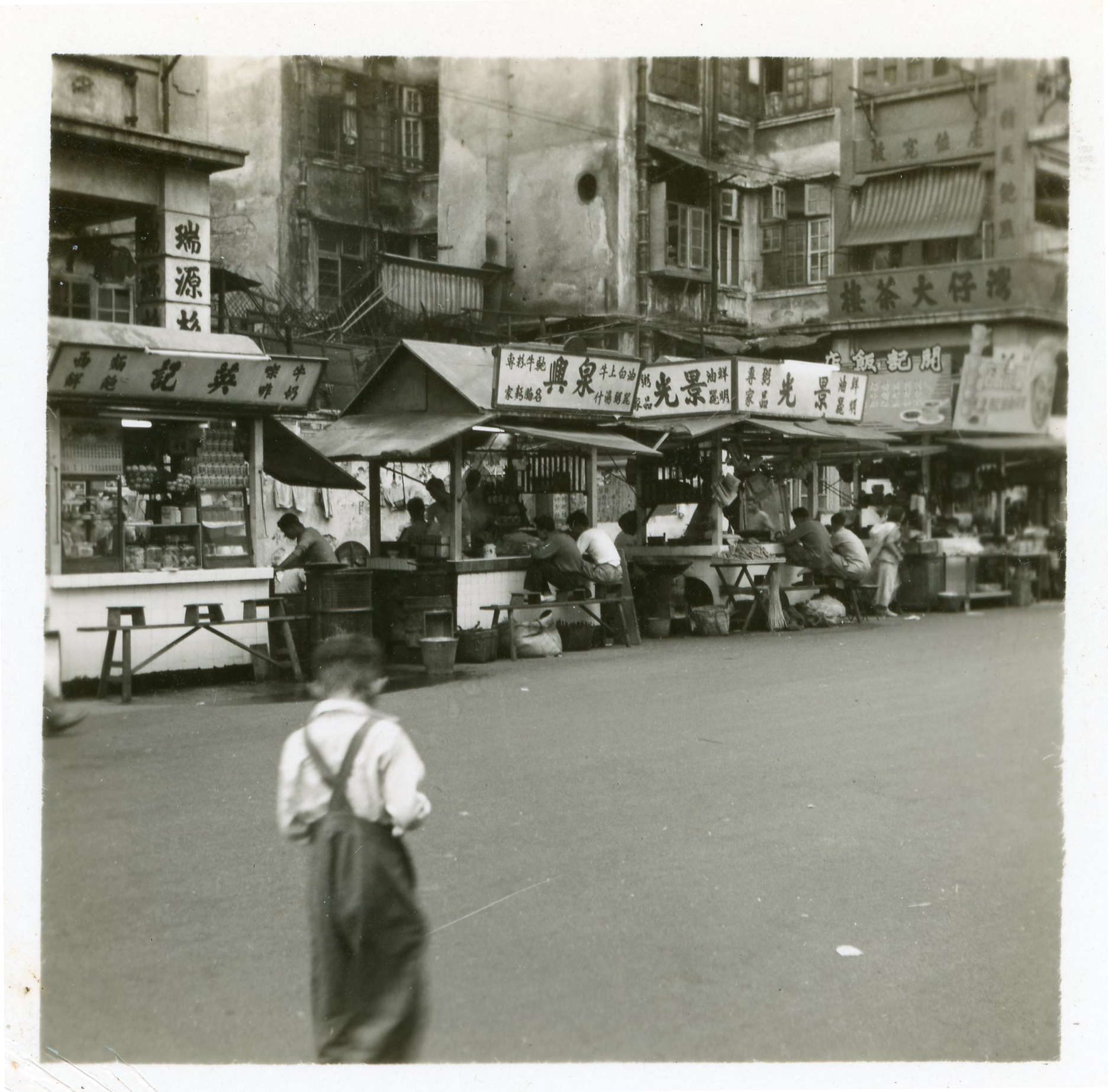由現榮華酒樓所在望向史釗域道的大牌檔,約1955年。右方為位於軒尼詩道的灣仔茶樓。