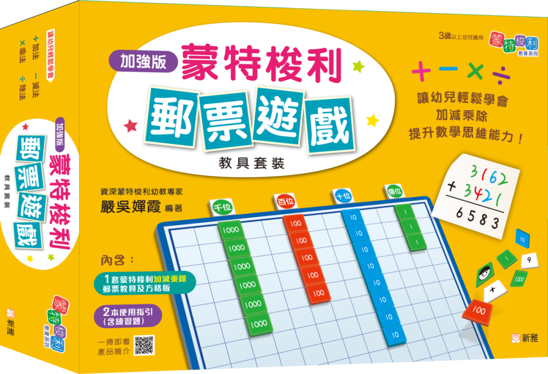 產品特色:把加減乘除變遊戲, 幼兒從此不再怕數學。根據傳統蒙特梭利郵票遊戲加以改進,讓幼兒透過操作實物教具,輕鬆掌握加減乘除的基本概念和演算方法,發展幼兒的數學思維能力。教具套裝包括:郵票實物教具、方格板及兩本使用指引。