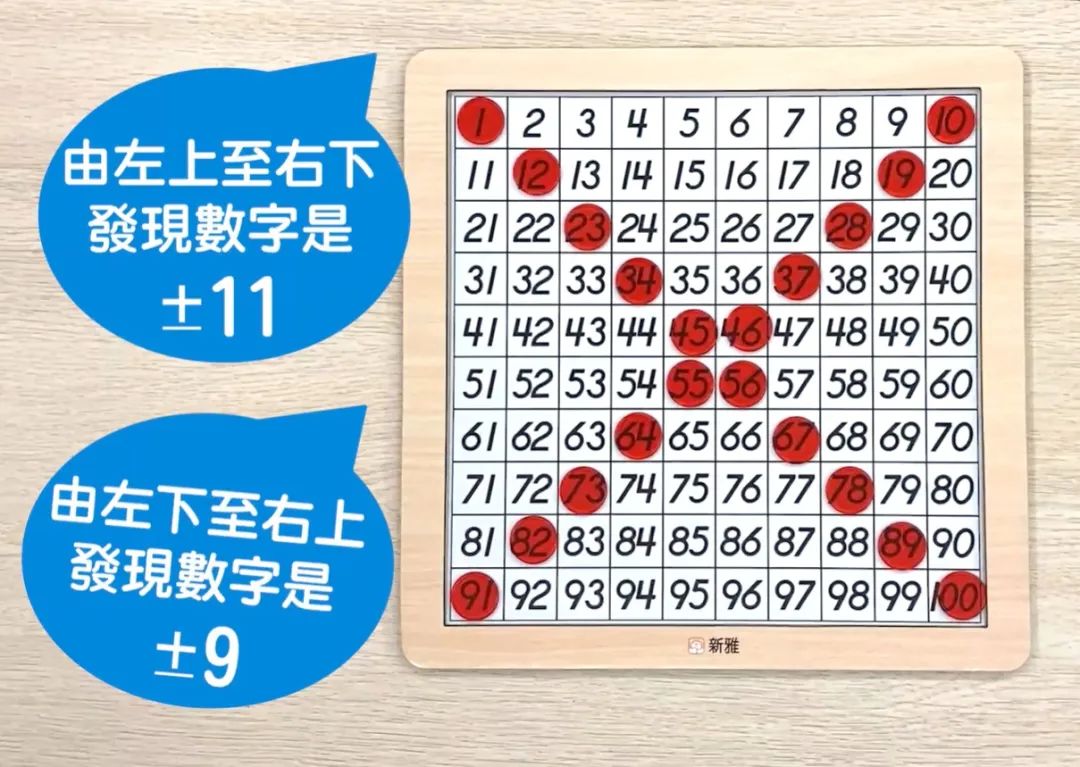在百數板的對角線擺放紅色小圓片,發現數字之間的秘密。