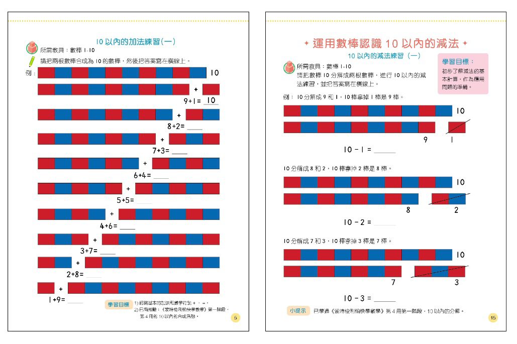 運用數棒教具進行分解和組合,學習基本的加減法。