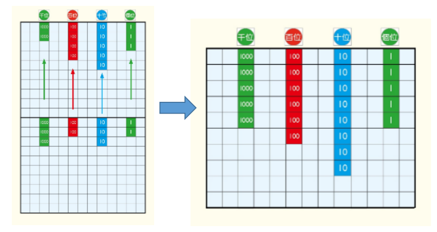 分別在方格板的上方和下方,擺放被加數和加數的個、十、百、千郵票,然後組合,就可得出加數的和。上圖的算式是2453 + 3232 = 5685。