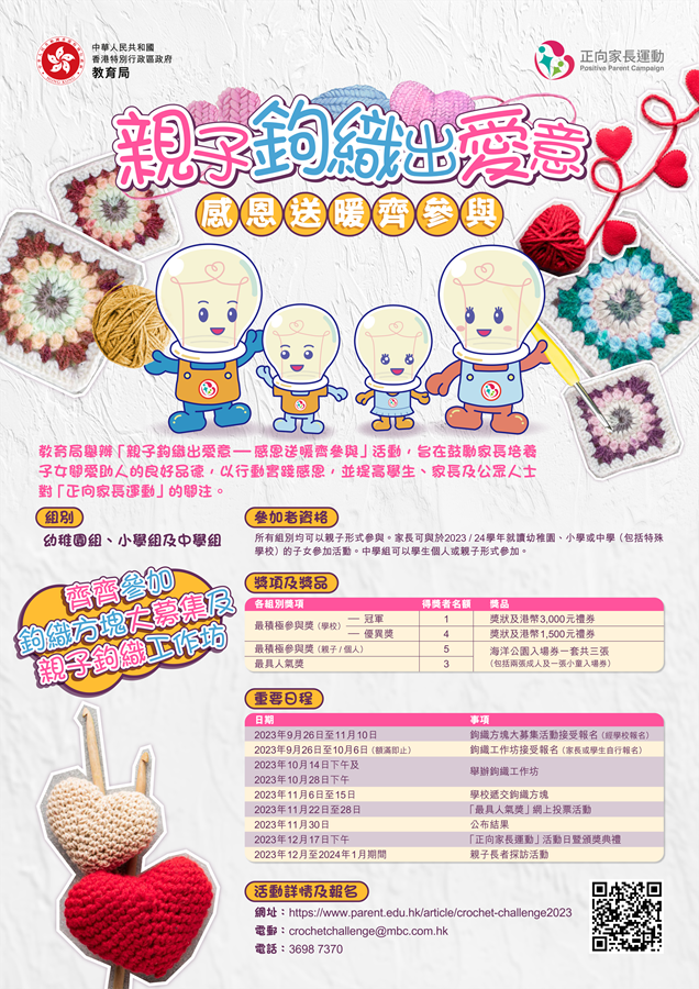 【橙訊】教育局正在舉辦舉辦「親子鉤織出愛意──感恩送暖齊參與」活動。通過活動,教育局向全港學校募集鉤織方塊,並將所得的鉤織方塊拼合成圍巾,送贈安老院舍或獨居的長者,既為他們添溫暖,也推廣長幼共融的文化。此次活動旨在鼓勵家長培養子女關愛助人的良好品德,以行動實踐感恩。