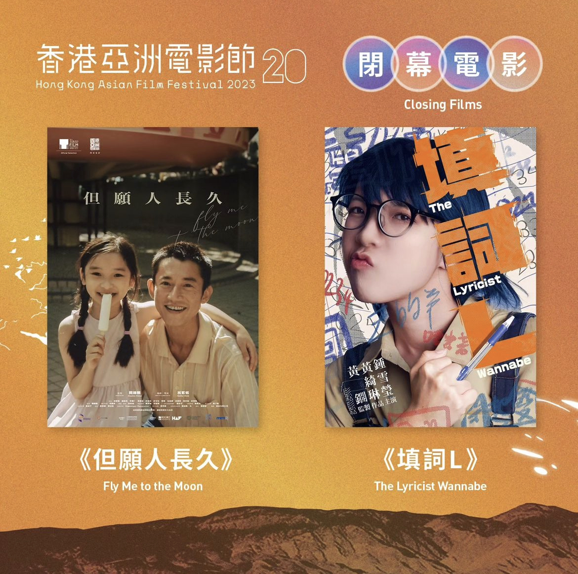 【橙訊】第20屆香港亞洲電影節繼2023年9月25日重磅公布三部開幕片後,於26日再揭曉今屆兩部閉幕電影,分別是親情題材劇情片《但願人長久》和首部關於粵語歌詞的作品《填詞L》。兩部閉幕電影均為港產片,繼續秉承香港亞洲電影節往屆傳統,力撐本土新導演。
