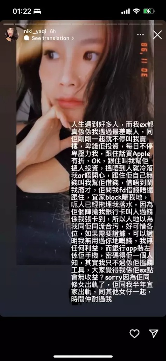平時,Niki熱愛在社交網站上分享日常點滴及短片等,不過有網民發現她曾經在IG公開「數臭」渣男前度4大問題。指對方一家不單騙錢,最終更導致她要出售個人物業等的對話,令到網民震驚!