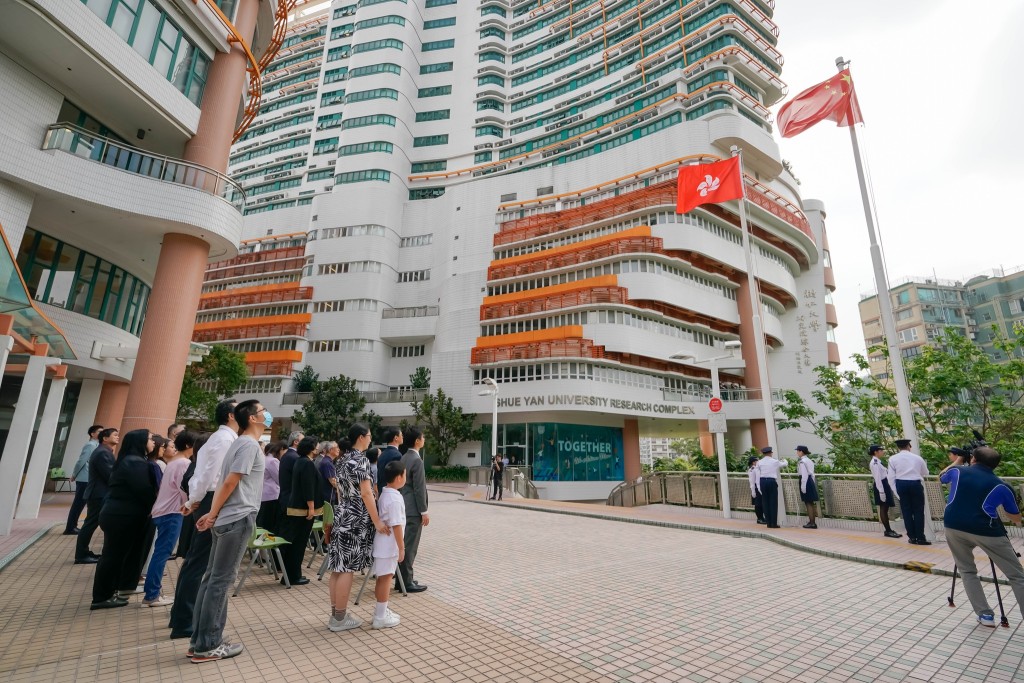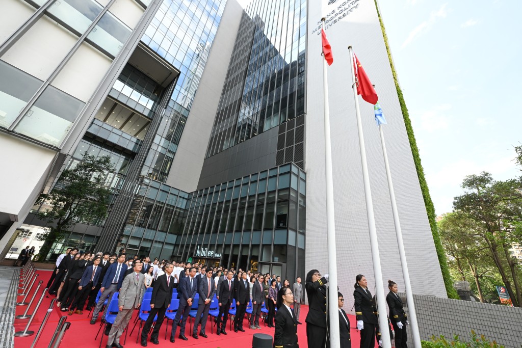 理大於校園新地標大學廣場舉行升旗儀式。逾一千名嘉賓及理大成員參與升旗儀式,當中亦包括近七十位到訪理大的清華大學師生,一同祝願國家富強昌盛,香港繁榮穩定。儀式由理大學生升旗隊負責。