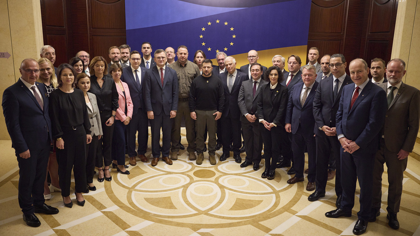 歐盟外長會議首次在基輔舉行,澤連斯基(中)與各國外長或代表在會議前合照。