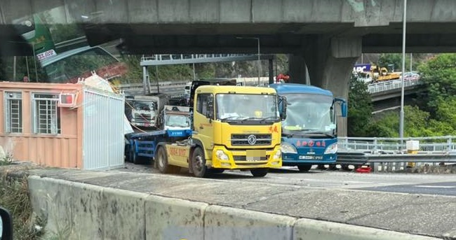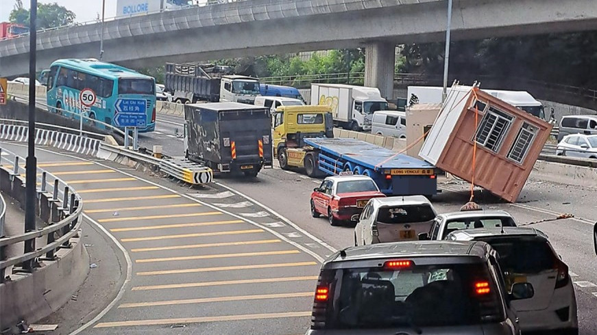 兩個貨櫃屋突然跌落路上,堵塞現場交通。