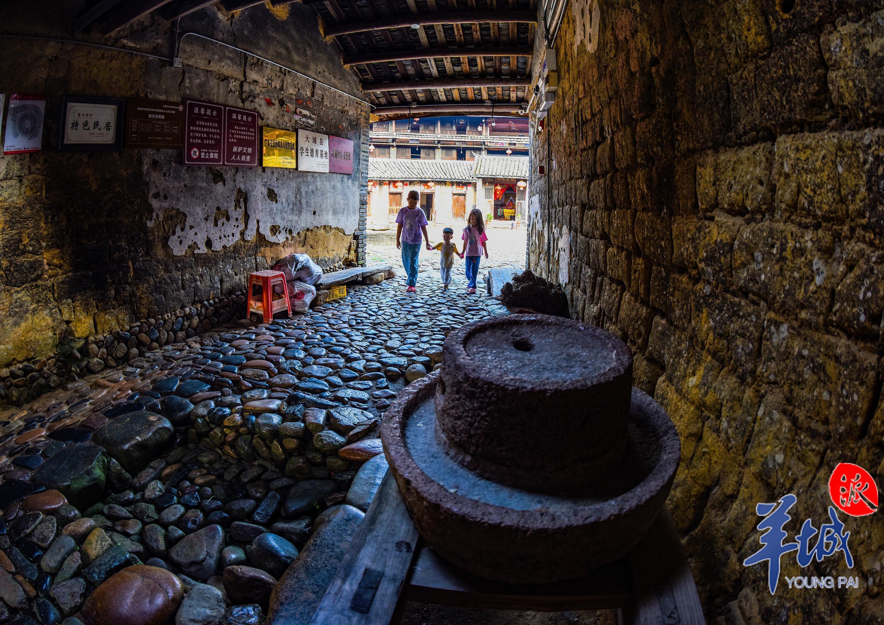 花萼樓前,只見深黃色的夯土牆已凹凸不平,見證了歲月的流逝。拱形大門上掛著兩盞燈籠,兩盞燈籠的中間用藍墨水寫著「花萼樓」三字,大門兩側則是一副對聯,紅底黑字,寫道:「花開常棣,萼發青雲。」踏上有著數百年歷史的鵝卵石道路,邁過門檻,進入樓中。陽光從過道的天井上灑下,照亮斑駁的石磨一角,石磨邊還放著犁耙、木桶、洗衣板等器具,記錄著田園牧歌的生活記憶。