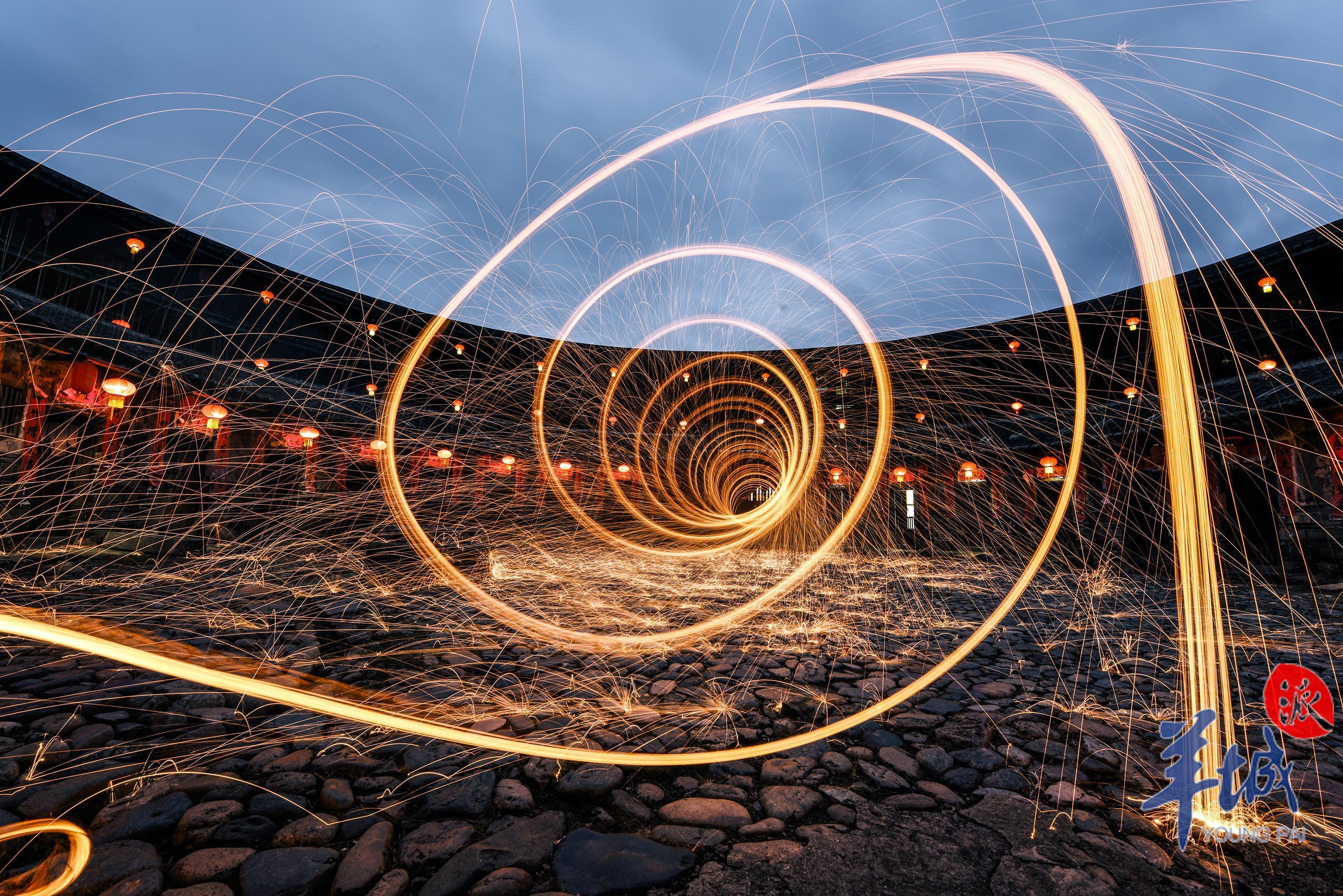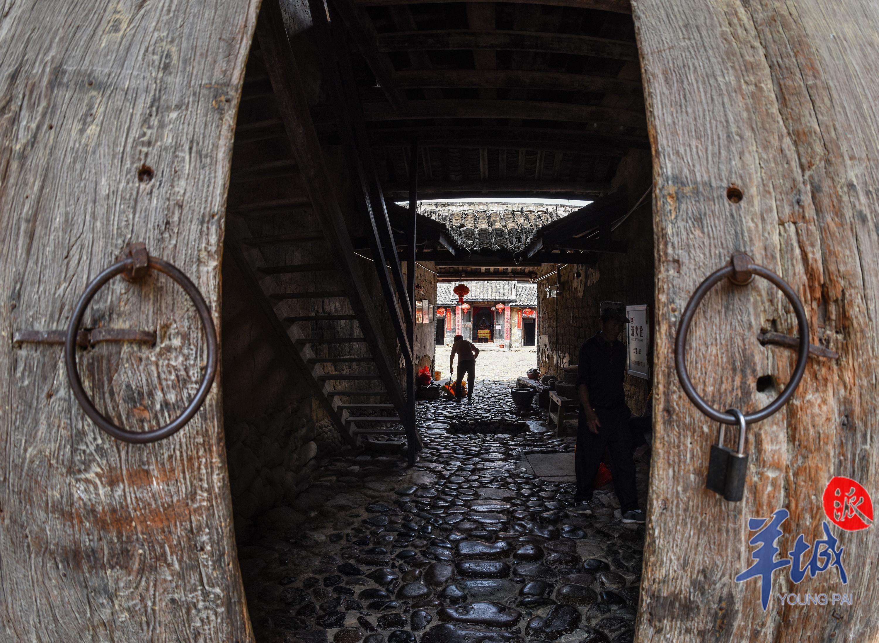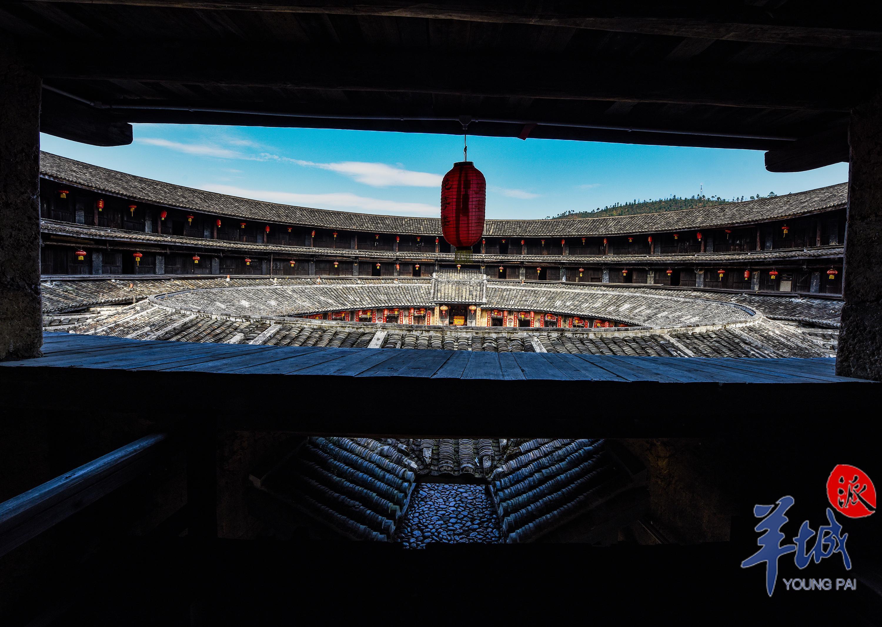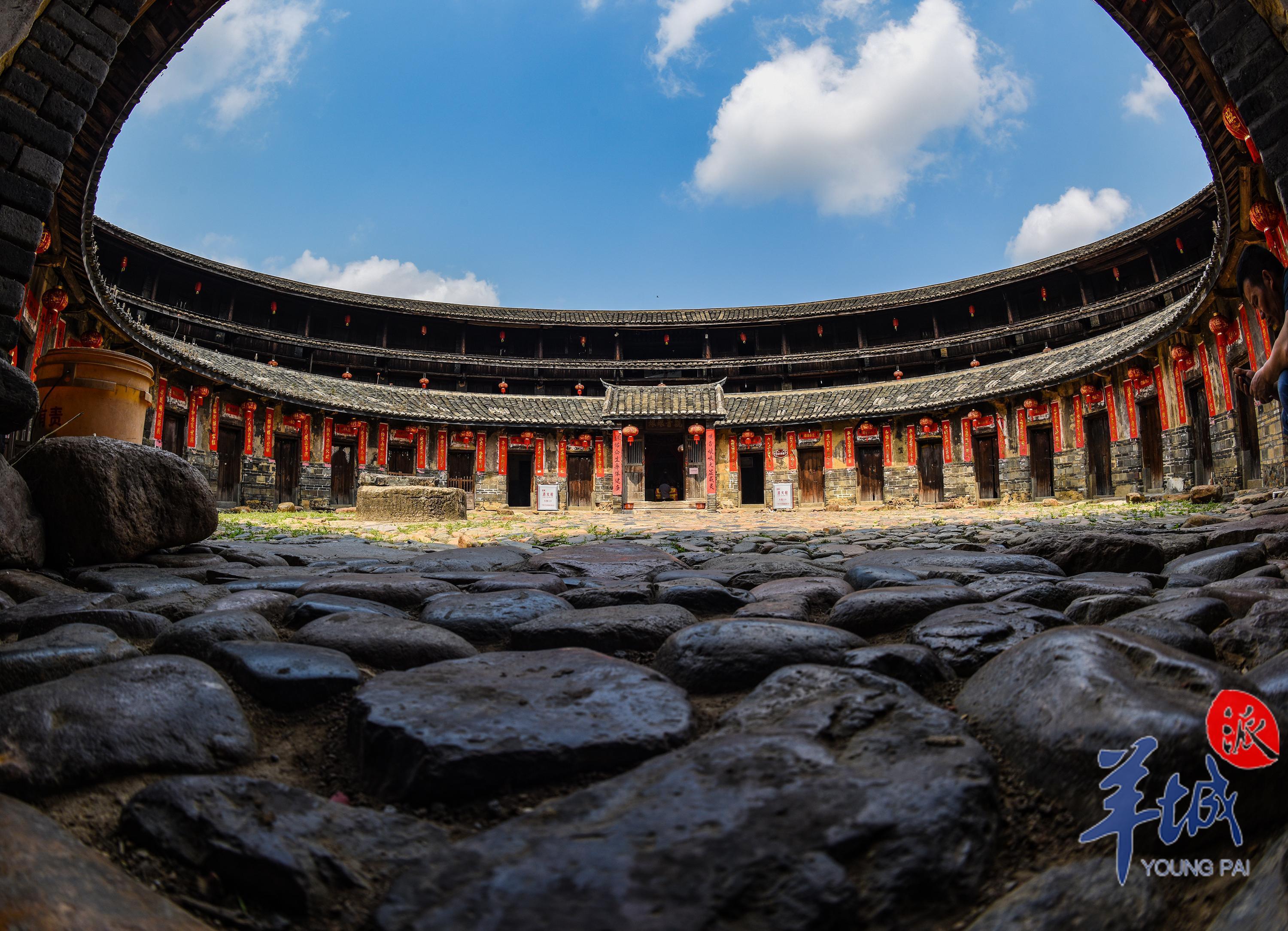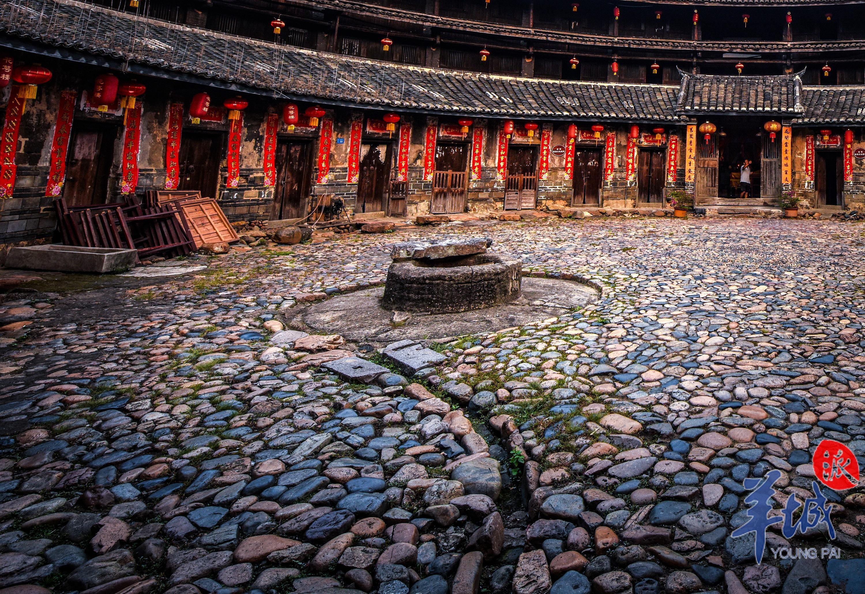 穿過過道,來到中央天井,環顧四視,一樓房屋門的兩側都貼著大紅色對聯,三層樓高的圍樓開著數百扇門,質樸的門戶上都掛著紅色燈籠,寄託著百年來不曾改變的對家庭團圓、生活美好的祝願。層層相疊的斑駁灰瓦,順著圓心向上拔高,向四周的天空延伸舒展。鵝卵石鋪就的地板已被打磨得光滑透亮,蒼蒼苔蘚蔓延攀爬,延伸至整個院落。天井中還有一口石井,圓形的井口布滿青苔的水痕,透過破損的井蓋向下看去,幽深的井水倒映著悠悠白雲。