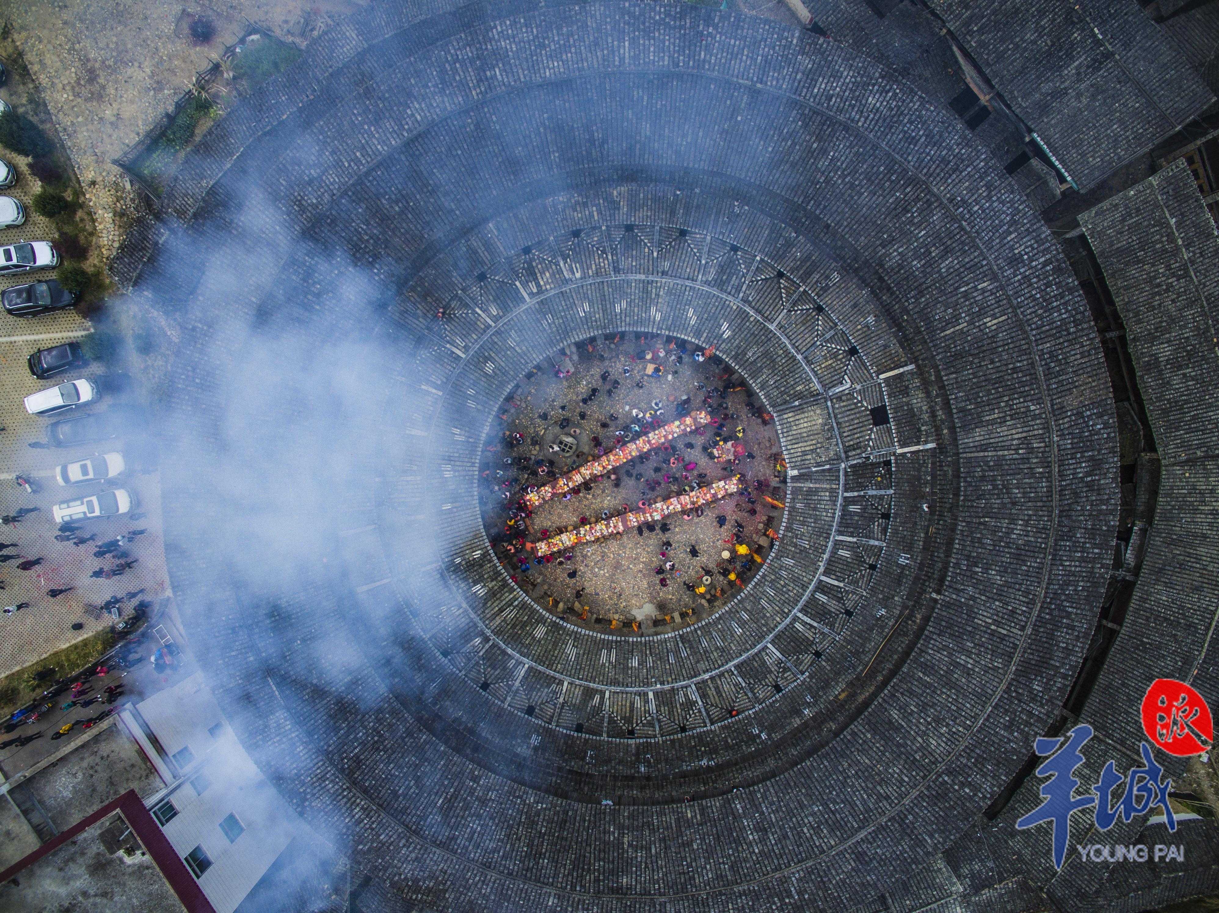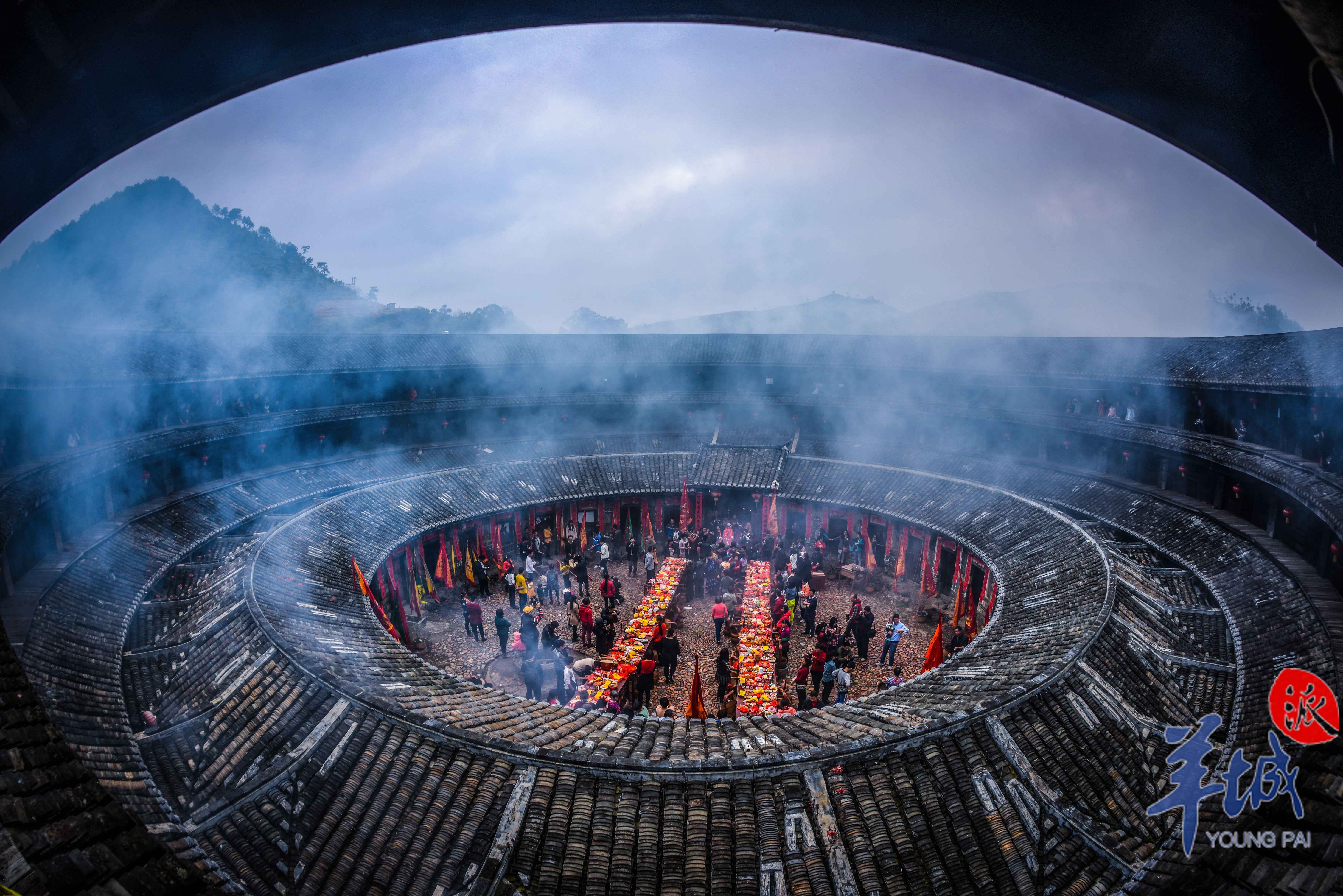 每年正月初三,村民都會聚集在花萼樓中,在此慶祝祈福,屆時,天井中將擺起兩排八仙桌,載滿雞鴨、酒水、發粄、水果……花萼樓內彩旗招展、香霧繚繞,在鞭炮鑼鼓聲中,人們共同祈求在新的一年能夠萬事如意、闔家幸福。