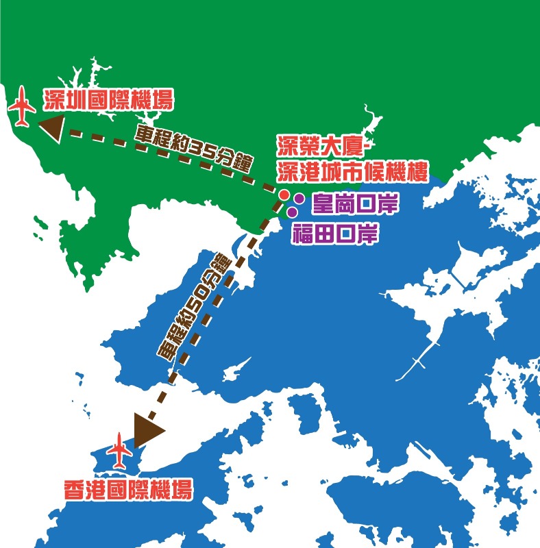 深港城市候機樓坐落於福田區深榮大廈,臨近福田口岸地鐵站D2出口,步行前往只需約5分鐘,距離皇崗口岸也只有700米。
