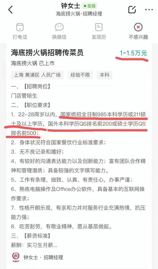 【橙訊】近日內地網上流傳火鍋連鎖店海底撈(06862)的一則招聘廣告,以用薪1萬至1.5萬招聘傳菜員,要求22至28歲,學歷竟然為「國家統招全日制985本科學歷或211 碩十及以上學歷」、「國外大學學歷QS排名前200或碩士學歷QS,排名前500。