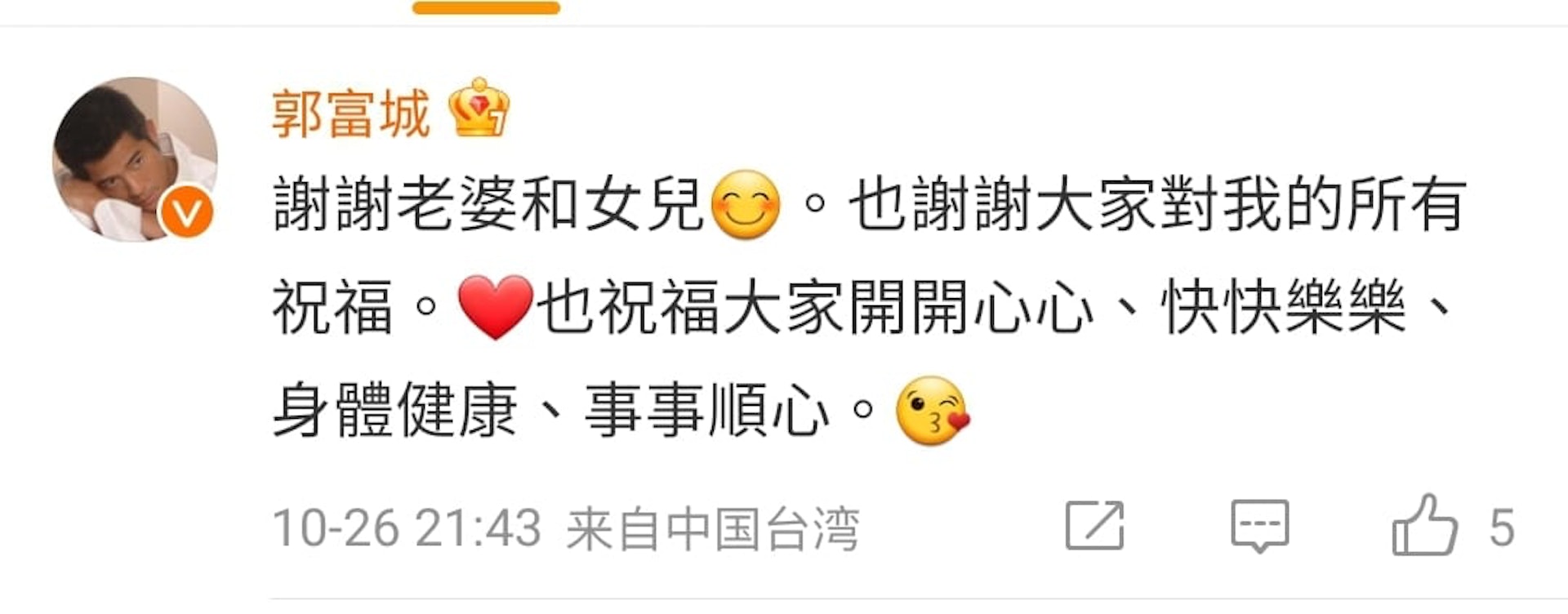 方媛在微博上祝賀城城:「老公生日快樂」,城城看見後回覆,隔空曬恩愛:「謝謝老婆和女兒。也謝謝大家對我的所有祝福。也祝福大家開開心心、快快樂樂、身體健康、事事順心。」簡直甜蜜度爆燈!