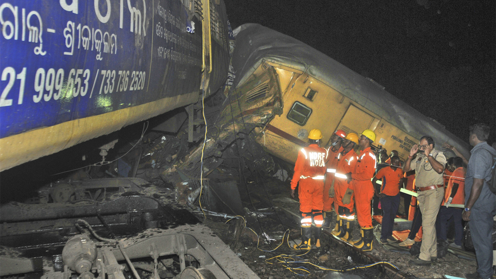 印度南部兩列火車相撞有車廂出軌,大批救援人員在場搜索死傷者。