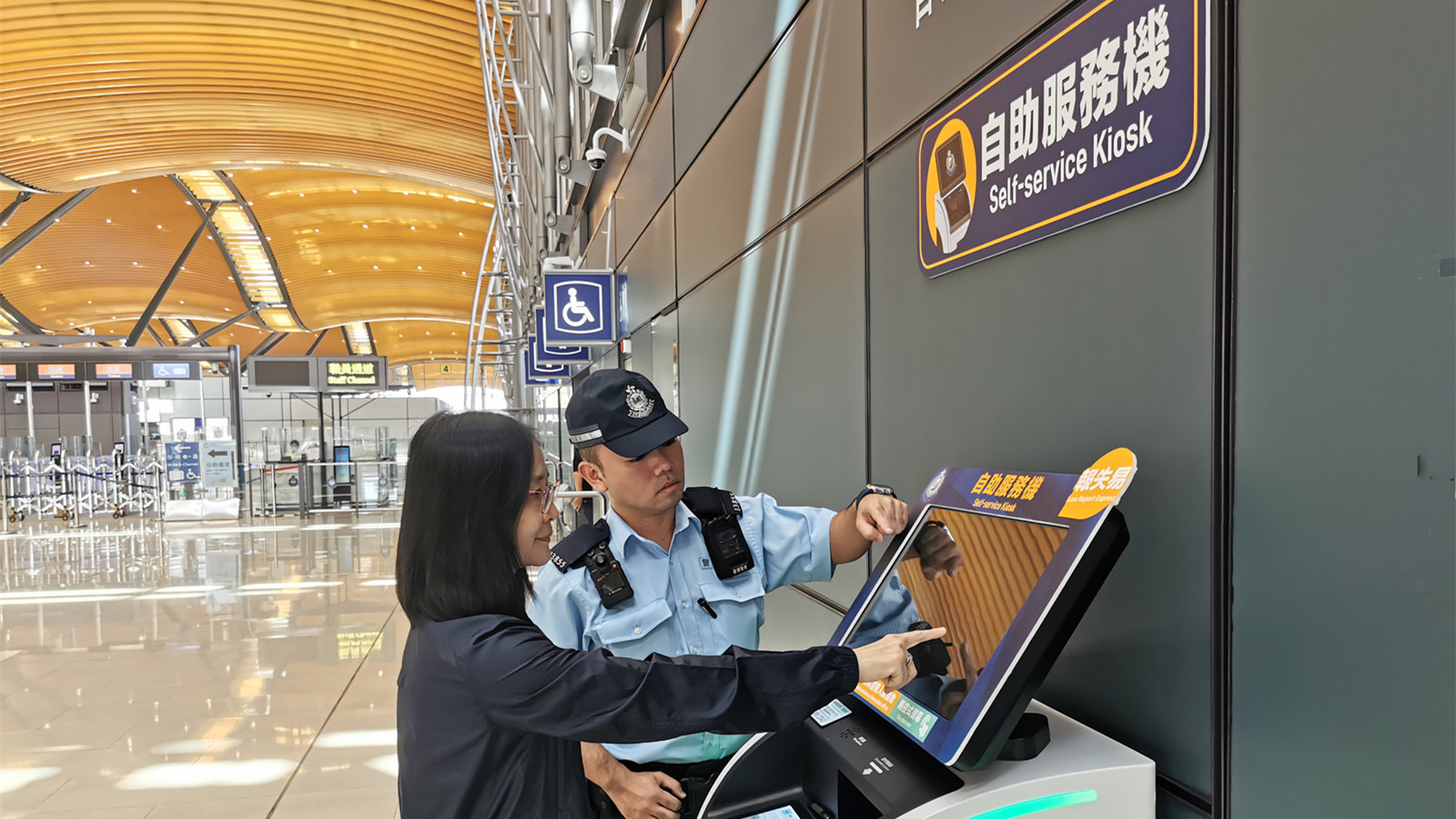 警方在港珠澳大橋香港口岸設自助服務機,警員向旅客介紹如何使用有關服務。