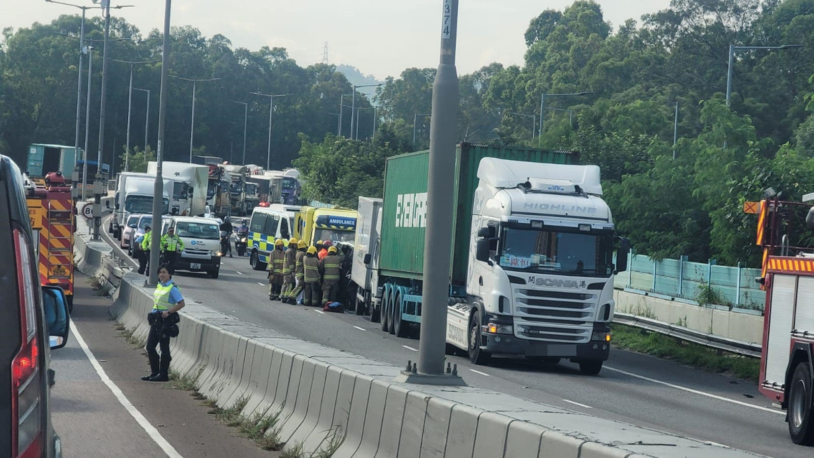 現場消息表示,一輛貨櫃車沿元朗公路往上水方向行駛,駛至上址時與尾隨的貨車及客貨車相撞。消息一度指有人被困在車內,但消防員到場後未發現有人被困。意外中客貨車司機清醒送院,警方在現場指揮交通及調查事故原因。