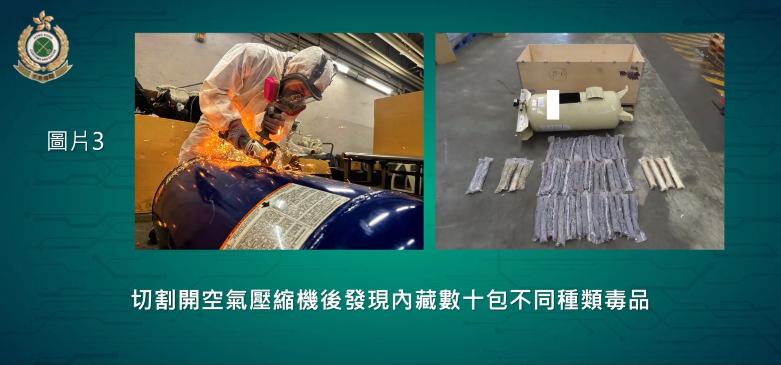 海關提到各空氣壓縮機「度身設計」放置不同的毒品,懷疑方便派送到指定的收貨人。