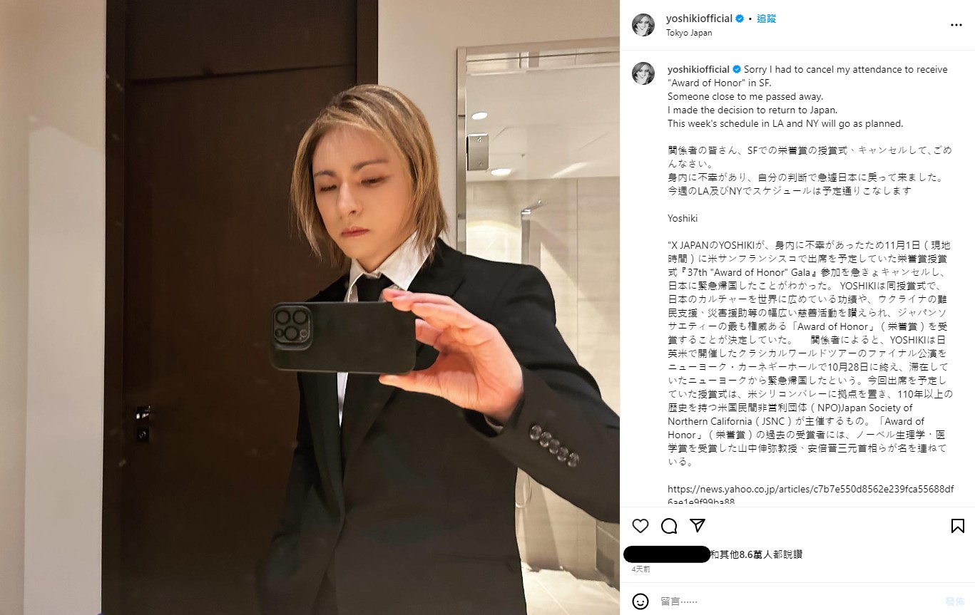 X JAPAN隊長兼鼓手YOSHIKI突然在社交網公開身穿喪服的自拍照,驚爆低音結他手HEATH離世消息(圖:yoshikiofficial@IG)