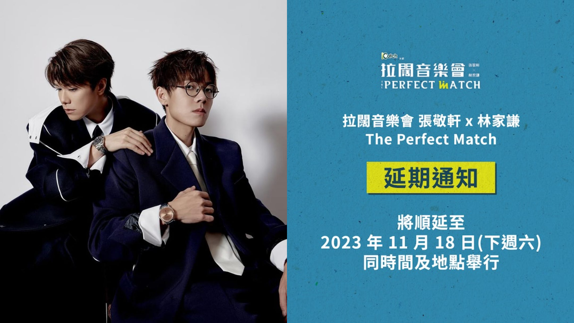【橙訊】林家謙和張敬軒原定11月11日於亞洲國際博覽館AsiaWorld Arena,晚上7時舉行《叱咤 903 主辦、Katch 優惠平台呈獻 拉闊音樂會張敬軒 x 林家謙 The Perfect Match》。但由於張敬軒患上感冒引致上呼吸道及聲帶嚴重發炎,大會今日(9日)宣布演唱會將順延至 2023 年 11 月 18 日(下週六)同時間及地點舉行。