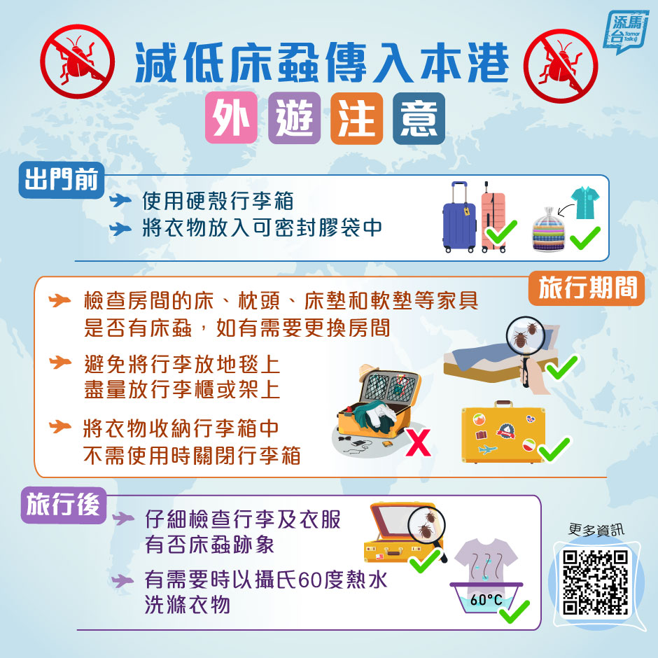政府在社交專頁「添馬台」以圖表方式,提醒市民在出遊前,應使用硬殼行李箱,將衣服放入可密封的膠袋中。而在旅行期間,應檢查房間的床、枕頭、床墊和軟墊等家具是否有床蝨,如有需要更換房間等。而旅行後應仔細檢查行李及衣服有否床蝨跡象,有需要時以攝氏60度的熱水洗滌衣物。