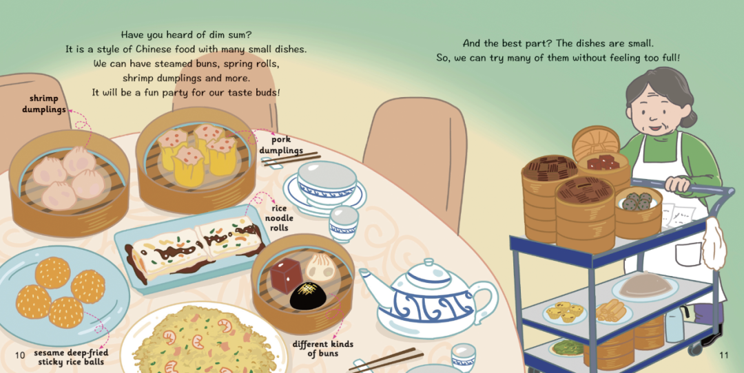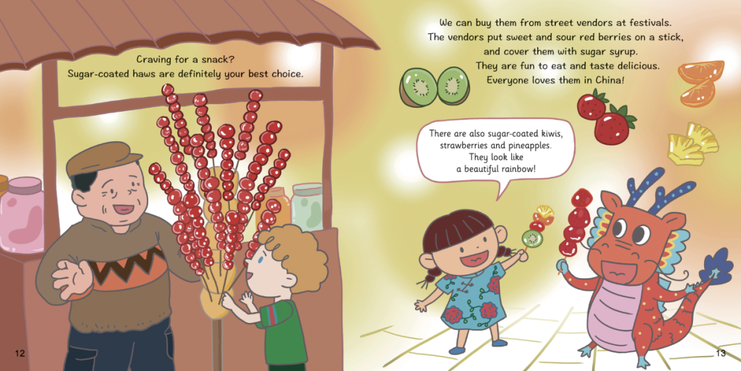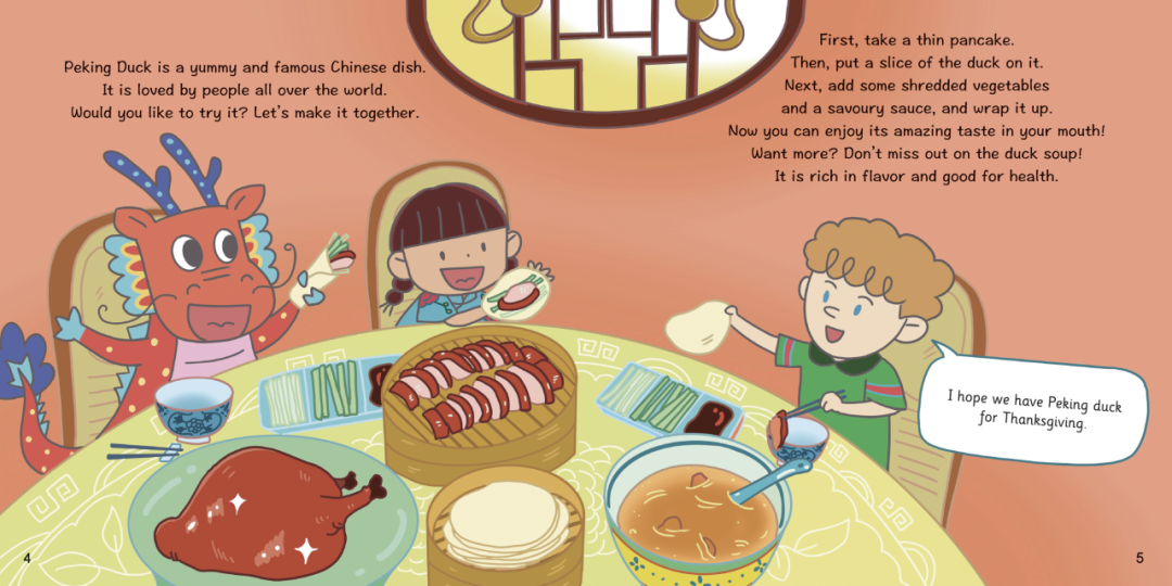 而在Chinese Food一書,Charlie和Ying Ying餓着肚子放學回家,竟在冰箱發現了Dragon C,隨即展開一趟中國美食之旅。一行三人品嘗美味可口的北京烤鴨、琳瑯滿目的茶樓點心、甜甜蜜蜜的冰糖葫蘆……想知道還包括什麼美食佳餚的話,就來翻開本書吧!