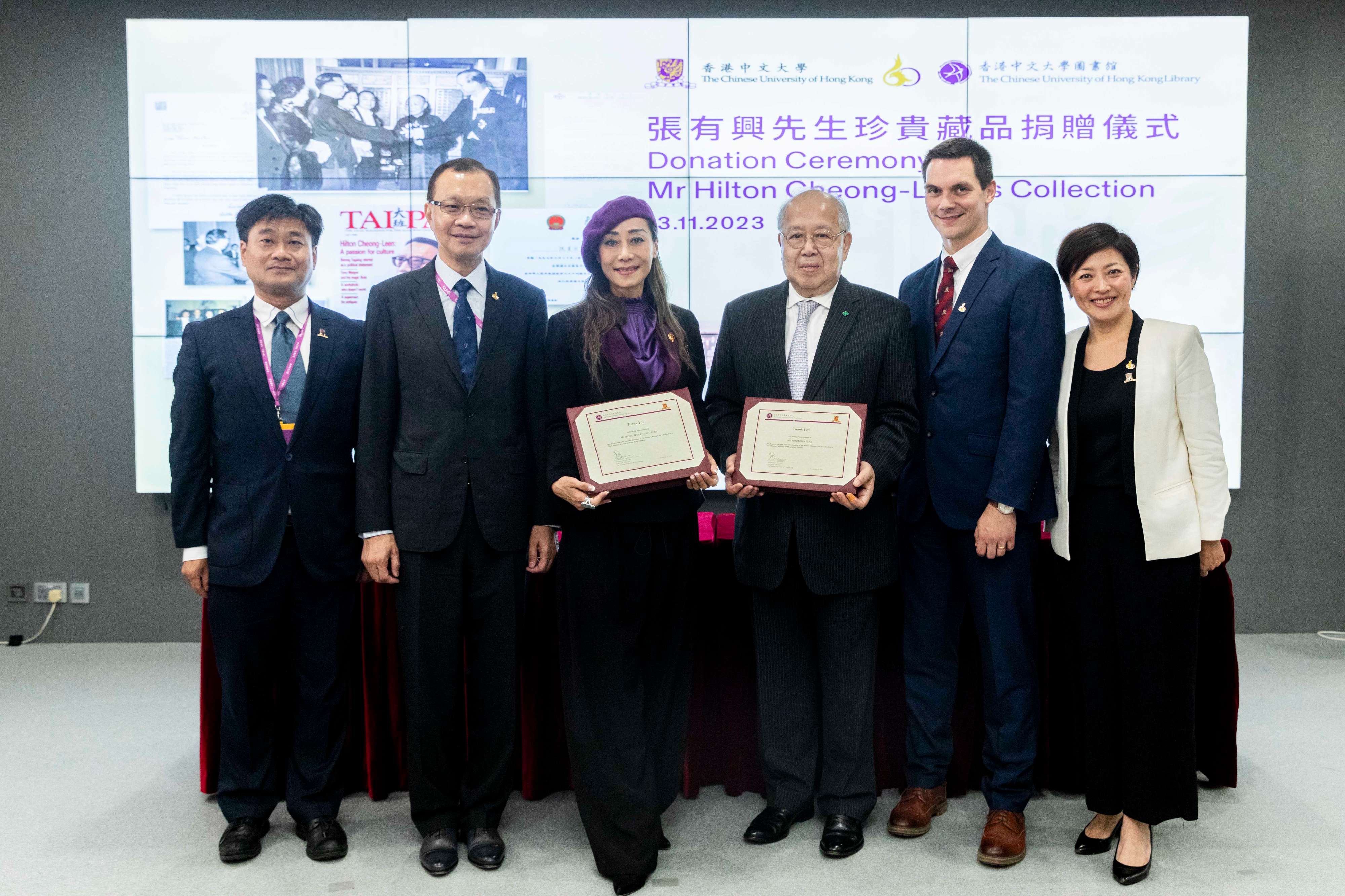 張有興先生珍貴藏品捐贈儀式。(左起)中大傳訊及公共關係處副處長張家偉、中大副校長(行政)及秘書長吳樹培、張天愛(張有興女兒)、香港公民協會主席林國華、中大圖書館館長文奈爾、中大傳訊及公共關係處處長張宏艷。