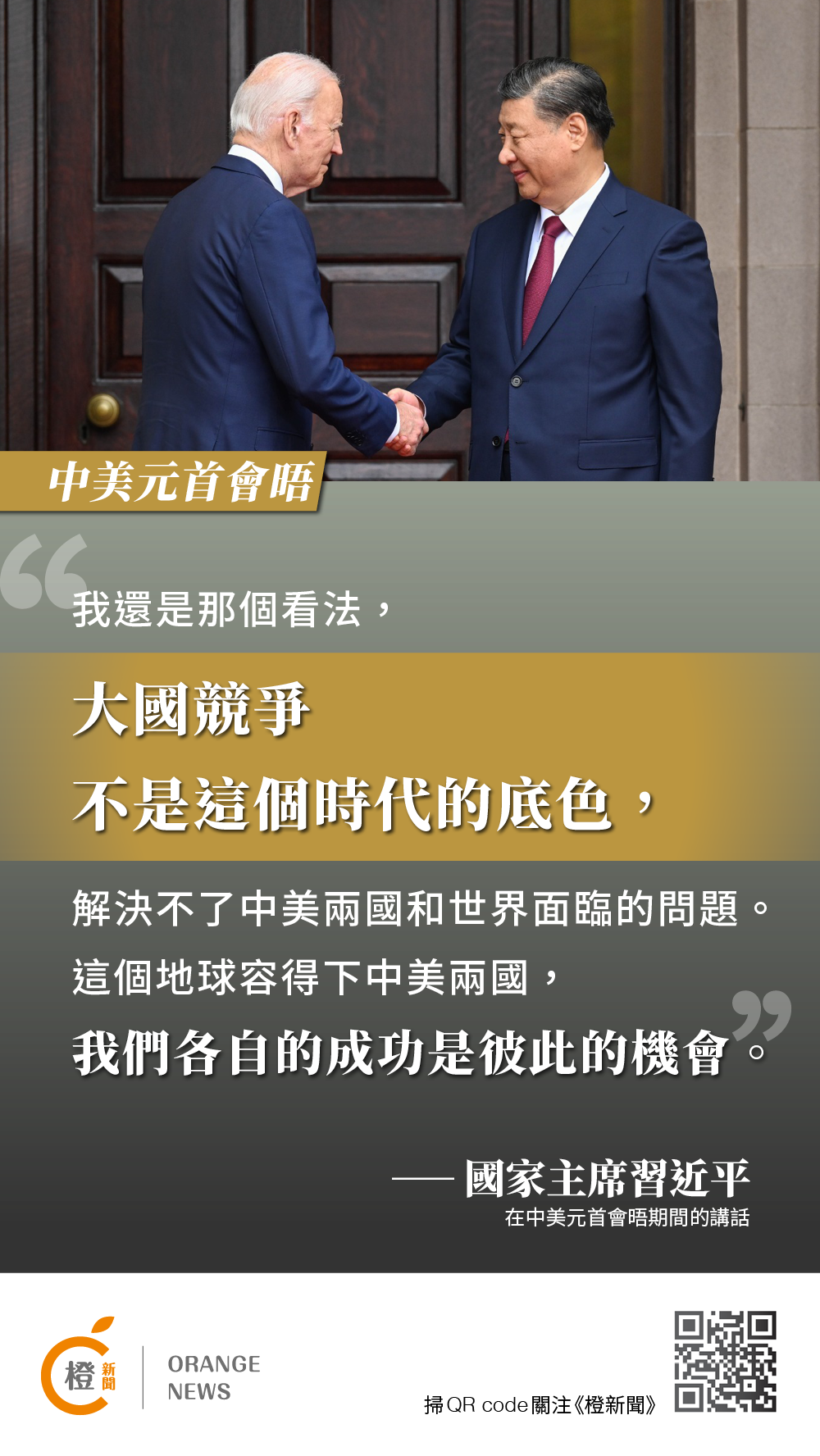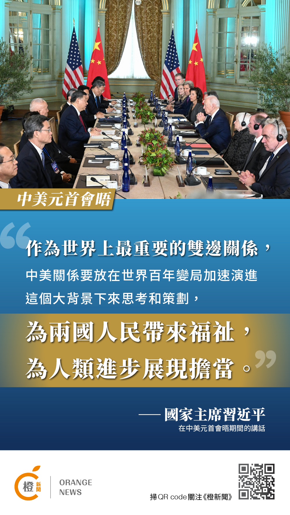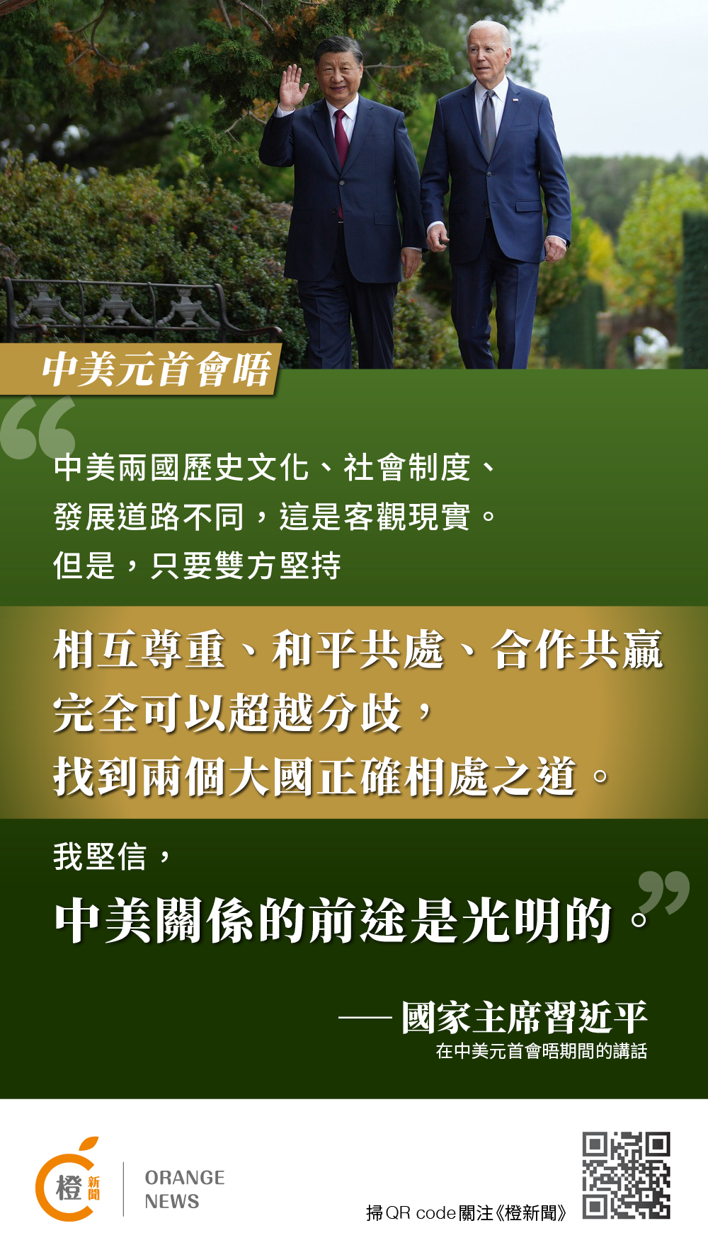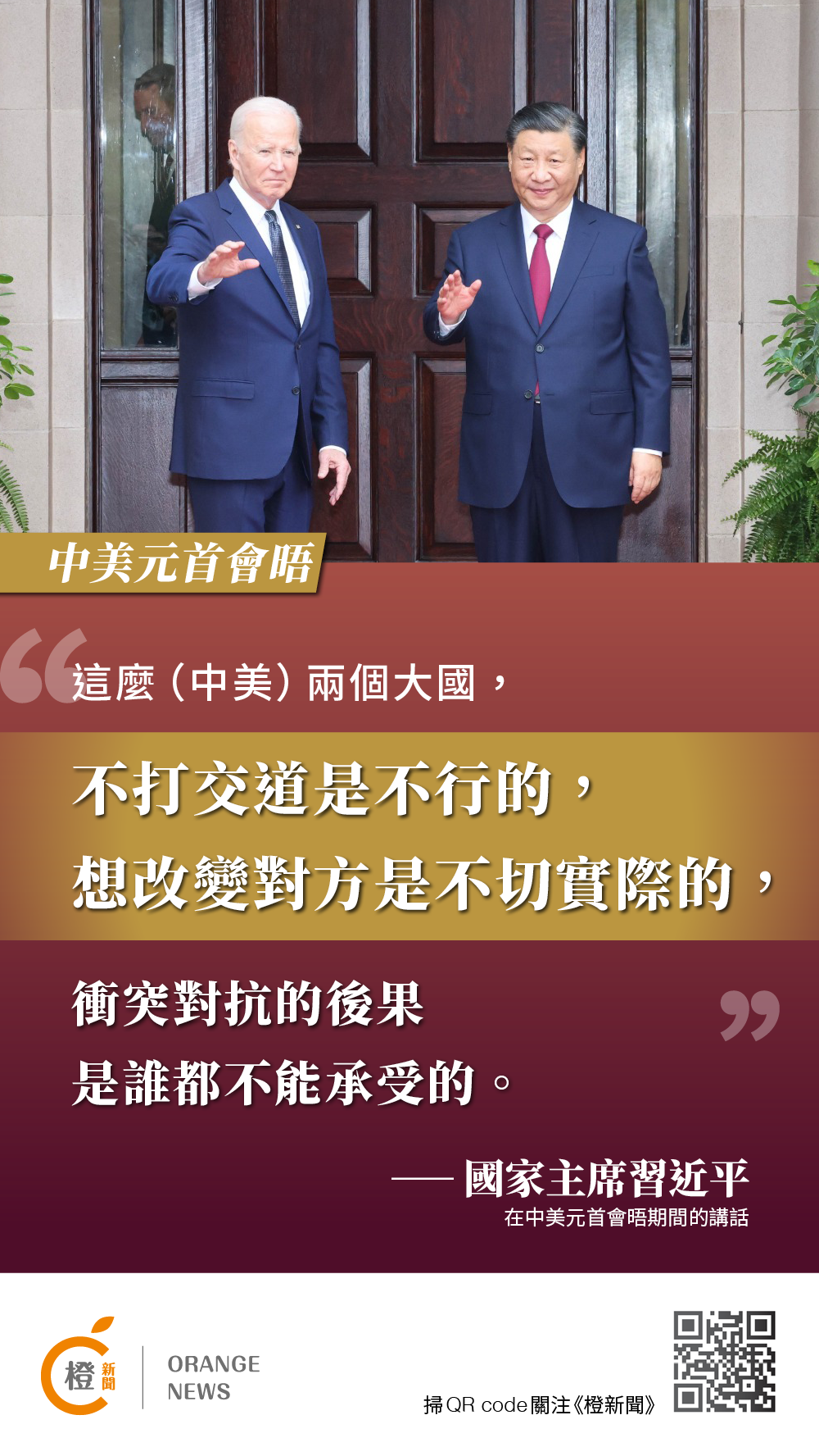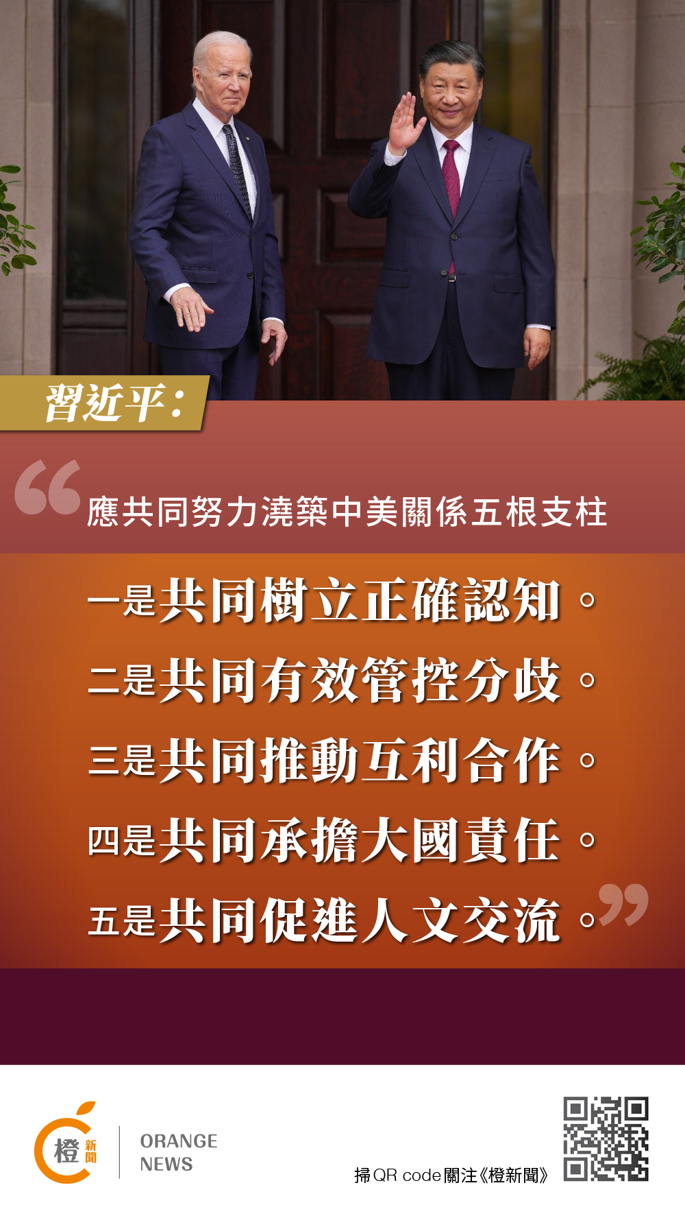 【橙訊】國家主席習近平當地時間周三(15日)在美國舊金山斐洛里莊園同美國總統拜登舉行中美元首會晤。兩國元首就事關中美關係的戰略性、全局性、方向性問題以及事關世界和平和發展的重大問題坦誠深入地交換了意見。習近平主席對中美關係有何重要表述?《橙新聞》在此為您整理習近平主席金句!