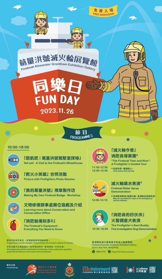 同樂日上午十時至下午六時舉行,市民可以參觀葛量洪號滅火輪的駕駛室,與消防員在船上合照留念,或參加由駐船退休消防員講解的「滅火輪今昔」導賞團,分享昔日船上的點滴。其他精彩活動包括下午二時的滅火輪噴水表演、火警調查犬表演及葛量洪號襟章製作坊等,讓大家透過各方面了解香港海上救援的工作細節。