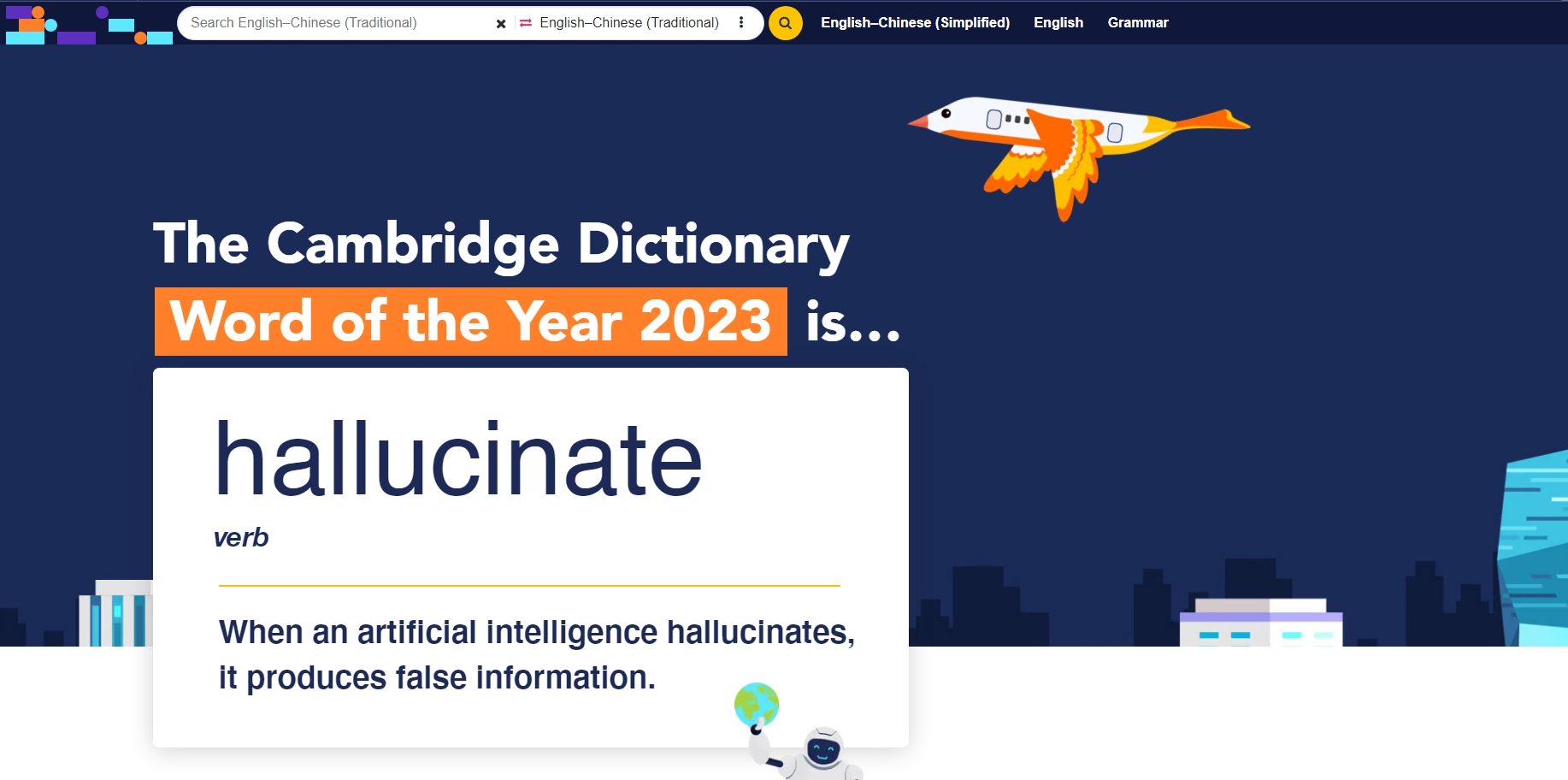 劍橋詞典近日公布了2023年年度詞彙:Hallucinate,意思為「產生幻覺」。詞典稱受人工智能的影響,這個詞在今年擁有了新的釋義。「Hallucinate」最初被定義為「人因生病或服用藥物等原因產生幻覺,彷彿看到、聽到、聞到、感覺到不存在的東西」,新釋義則意指人工智能會模仿人類,亦會傳播虛假資訊,令人產生「幻覺」。