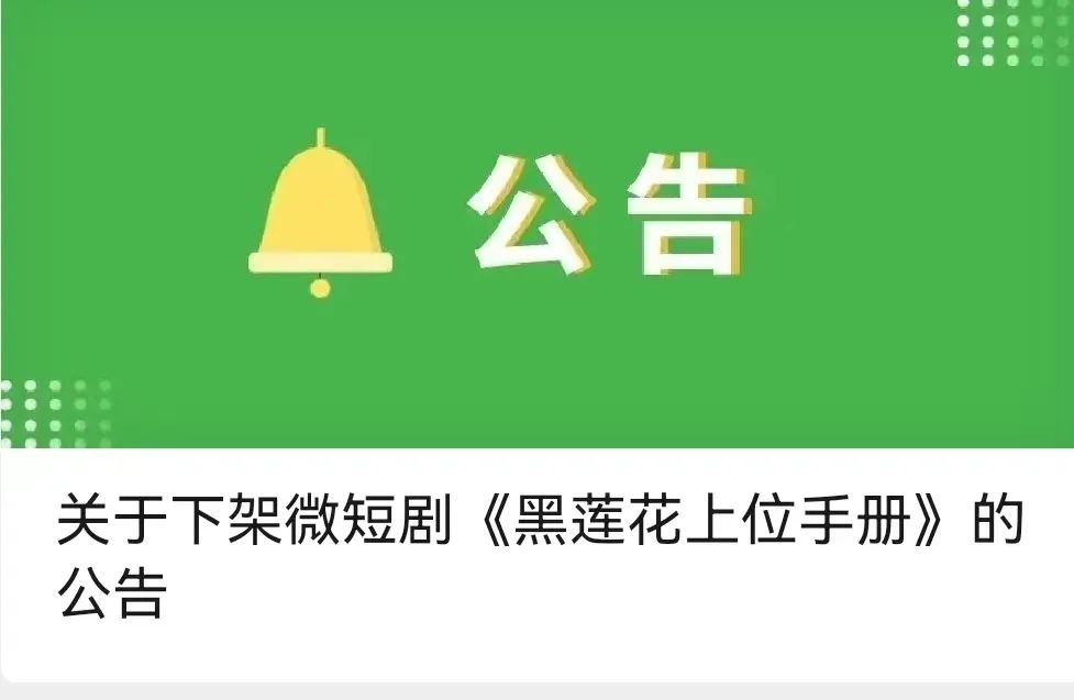 微信「珊瑚安全」昨日發布公告表示,平台發現微短劇《黑蓮花上位手冊》渲染極端復仇、以暴制暴的不良價值觀,混淆是非觀念,破壞平台良好生態,平台已將該劇下架,現予以公示。同日,安全中心也發布公告稱,近期,平台在巡查中發現,微短劇《黑蓮花上位手冊》渲染極端復仇、以暴制暴,是非觀念混淆,過度渲染人性中的惡,帶來負面的 價值導向。平台已將該劇下架,現予以公示。