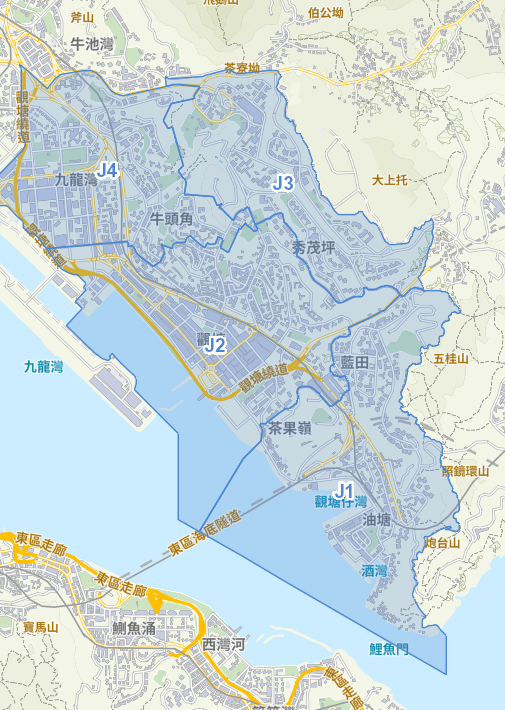 觀塘東南(J1)、觀塘中(J2)、觀塘北(J3)、觀塘西(J4)。