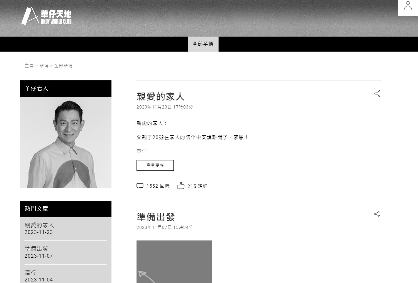 【橙訊】天王劉德華父親劉禮昨日(23日)傳出離世消息,同日下午約5時,「華仔天地」亦證實噩耗。「華仔天地」華博公布劉父死訊,大批歌迷留言安慰劉德華,而華博亦轉為黑白色界面以悼念劉父。