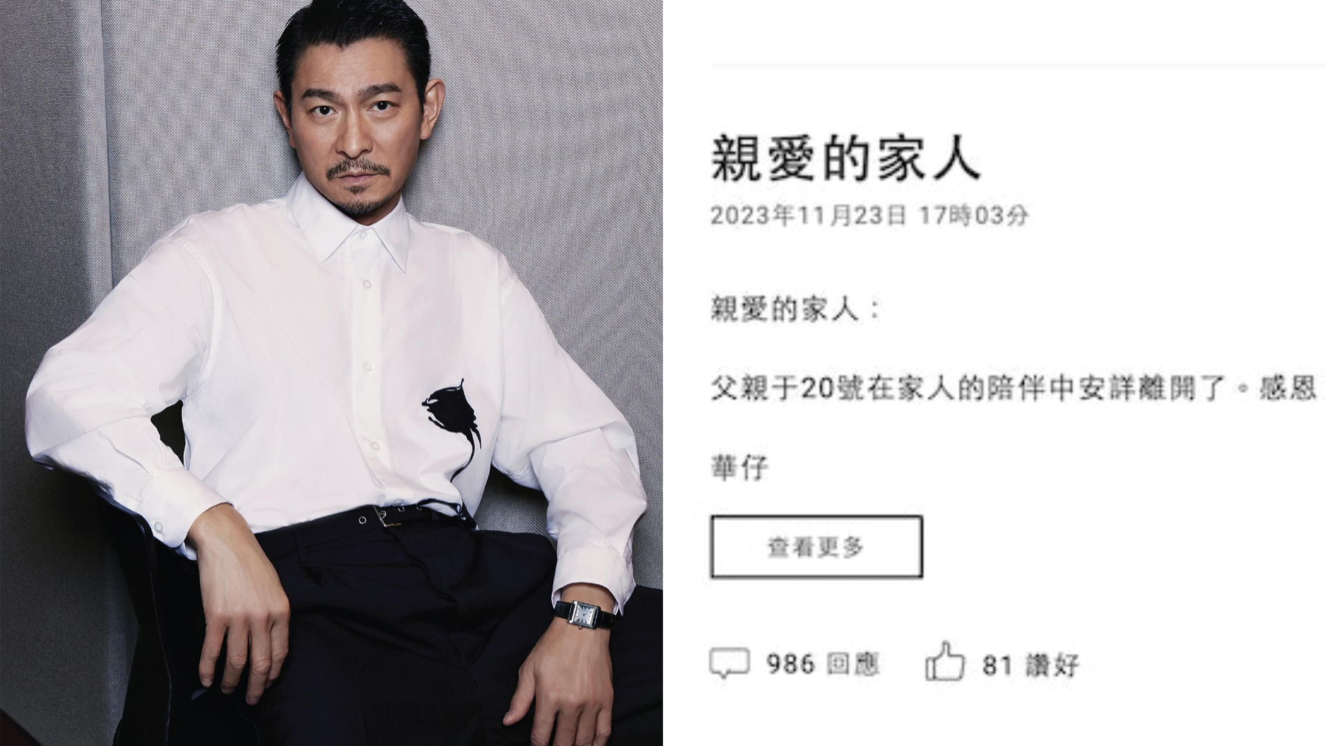 官方隨後回應表示:「各位手足有關華仔在華仔天地發文父親離世有以下回應:『家父於20號在家人陪伴下安詳離世,現正處理他的身後事,多謝大家關心 。』」