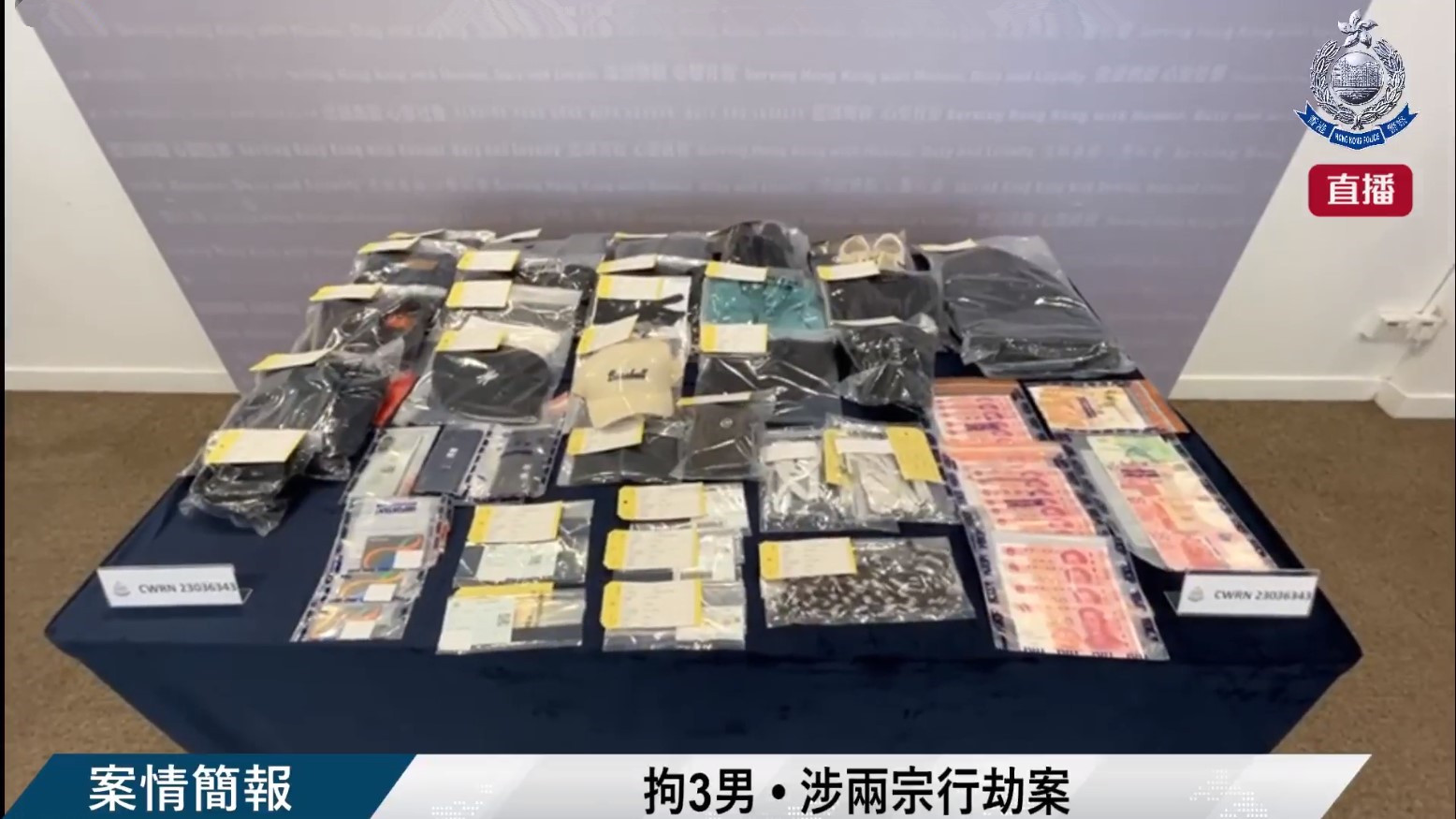 警方展示從三名雙程證疑犯男子搜出的現金及其他相關證物。
